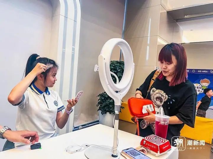 取完号,母女俩趁着等待拍护照证件照的间隙,一边吃着汉堡,一边整理发型。徐女士说,女儿一放学就带着她去买了汉堡,匆匆赶来了。