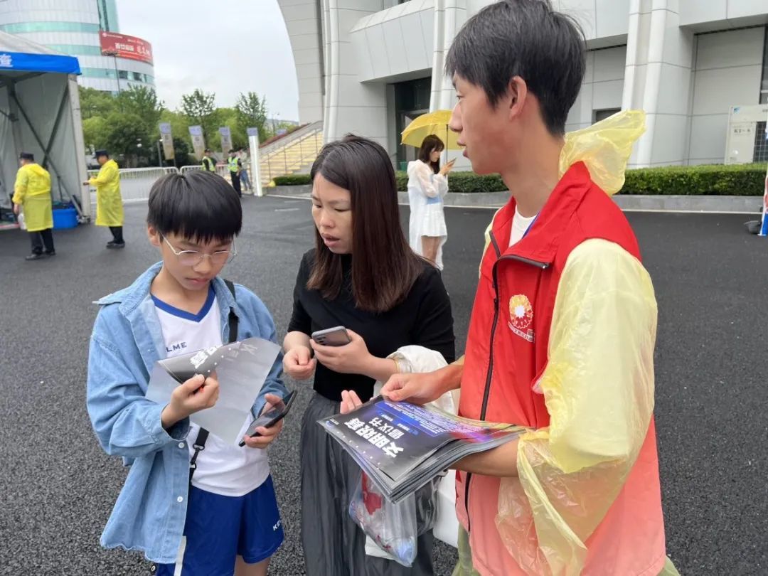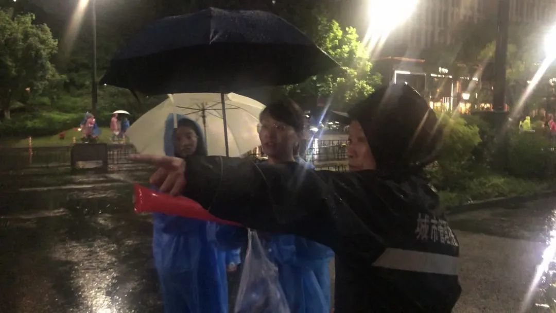 场外大雨中,公安正在执勤,交警负责疏通秩序,城管在周边巡逻,穿着亮色马甲的志愿者们正在引导观众入场检票……大家各司其职、奔走忙碌,用自己的专业和热情,让大家有了满满的安全感。