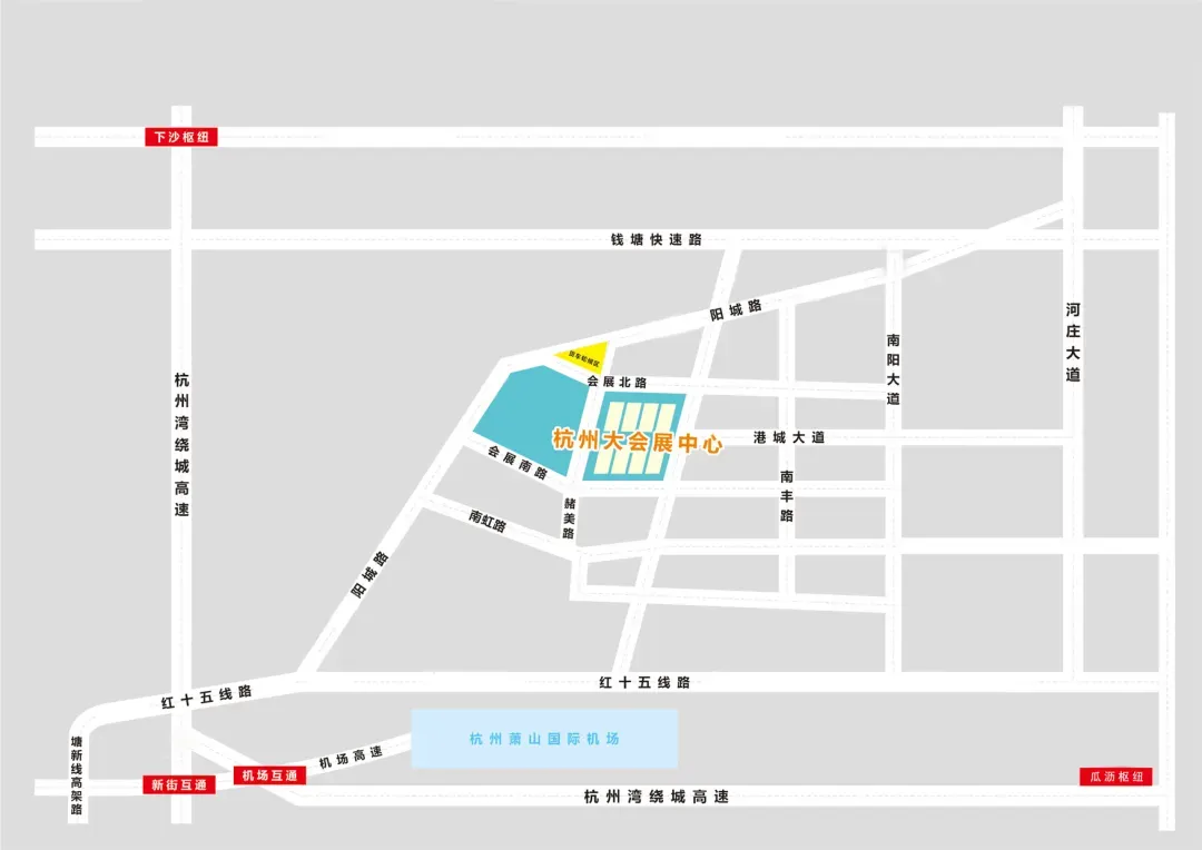 宁波及机场方向:红十五线→南阳大道→向阳路→经四路→南虹路→赭美路→会展南路,2号门进入场馆。