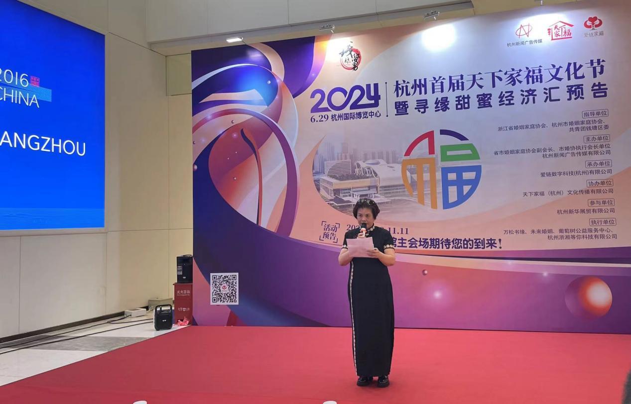 6月29日,由浙江省婚姻家庭协会副会长、杭州市婚姻家庭协会执行会长单位——杭州新闻广告传媒有限公司主办的杭州首届天下家福文化节暨西子爱情甜蜜经济汇之预告活动在杭州国际博览中心圆满举办,来自浙江省内的单身青年男女、婚恋行业代表、志愿者等100余人参加此次活动。并特别邀请了杭州市民政局社会事务处二级调研员许东良、杭州市婚姻家庭协会会长陶陶、浙江省婚姻家庭协会办公室主任徐一烨等嘉宾出席本次活动。