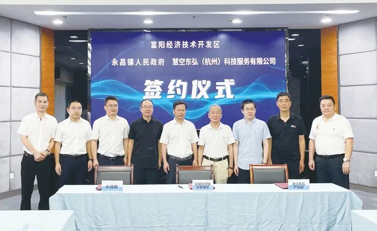 2022年9月6日 ,富阳经济技术开发区、永昌镇人民政府与慧空东弘(杭州)科技服务有限公司举行签约仪式,全力推进产业园建设。其间,永昌镇对接了浙江大学教授、浙江大学科技园创始人金水棠,引入其慧空(杭州)科技服务有限公司管理团队作为运营方,着力招引泛浙大及海内外高层次人才优质产业化项目,以及公司在滨江、西湖基地孵化成熟的成长型企业。