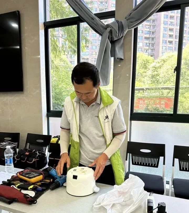 “我看看。”吴师傅拆开底板,扒拉开电线,很快就找出了问题,原来是电线漏电了。他熟练地换上了一根新的电线,让居民拿回去试试。