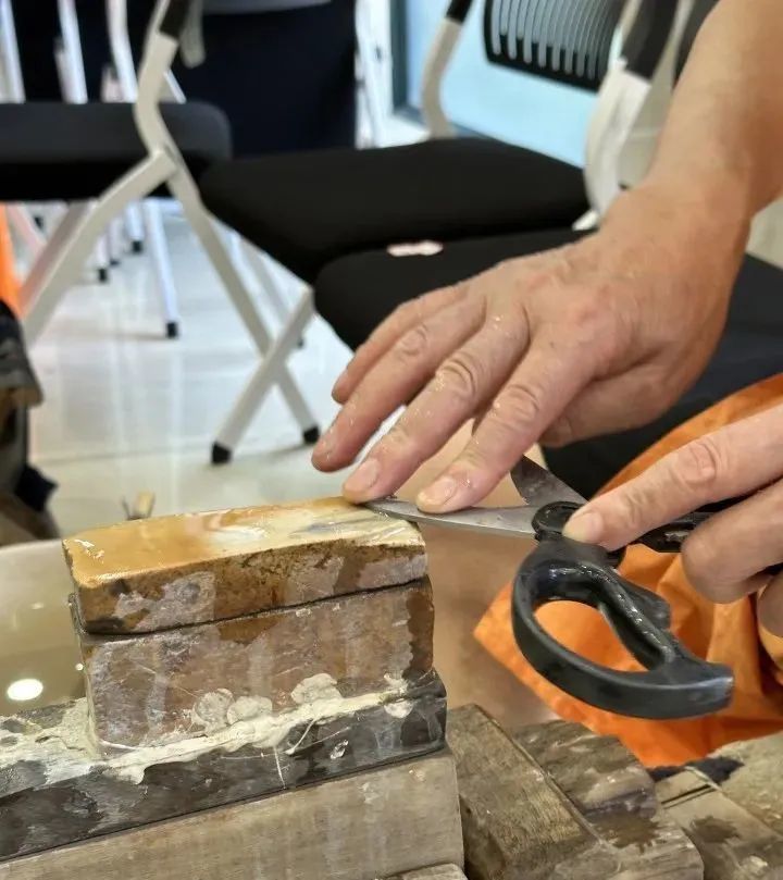姜师傅磨几下刀片,就用蘸了水的刷子刷一下,并调整一下方向。