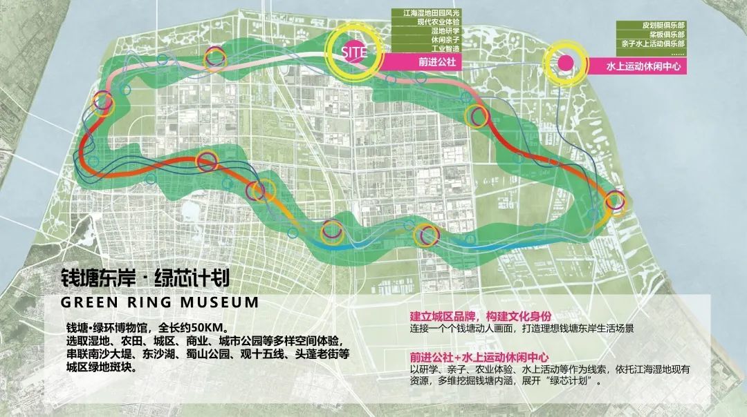 此外,新前进公社项目作为“钱塘东岸·绿芯计划”的重要一环和切入口,将与杭州钱塘大湾区湿地公园、钱塘小雅、东沙湖公园等板块串联起一条绿环博物馆,构建钱塘江东区块农文旅未来新格局。