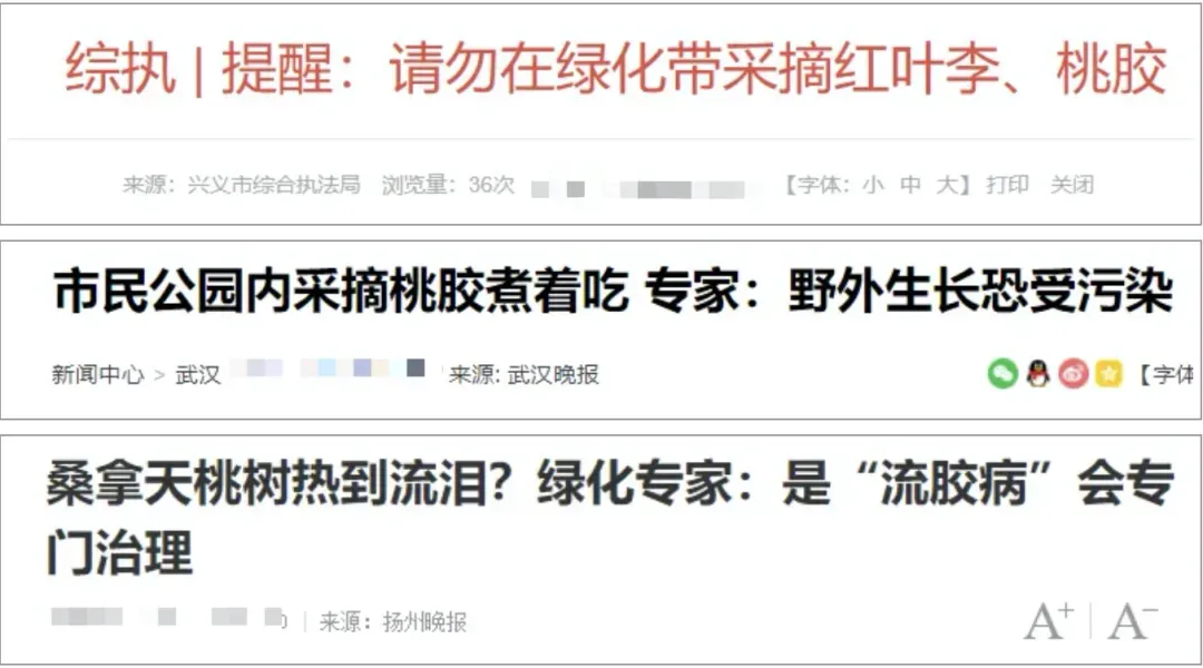 市园林绿化部门每年都会观测到不少市民会去户外采摘, 在此他也提醒大家: 户外桃胶形成时间长了会产生霉变,难以观察分辨 ,如需食用还是通过正规购买途径;此外,公共绿地上桃胶多因为虫害引起,我市园林绿化部门会进行刮除后用药防治,会有一定的农药残留,广大市民不要随意采摘和食用。