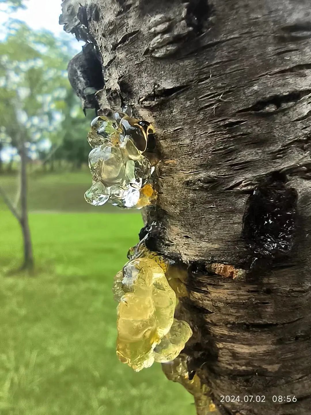 桃胶的形成是桃树在外力作用下产生伤口,夏季天热的时候更容易形成。一是昆虫活动旺盛,比如天牛会啃食树皮造成伤口;二是树干本身的新陈代谢更加频繁,树干内的营养物质反复渗透,黏稠的液体通过太阳晒干,凝结成固体即桃胶。