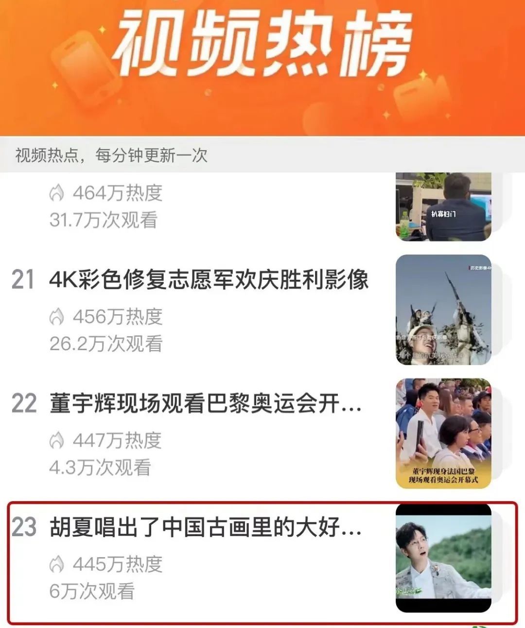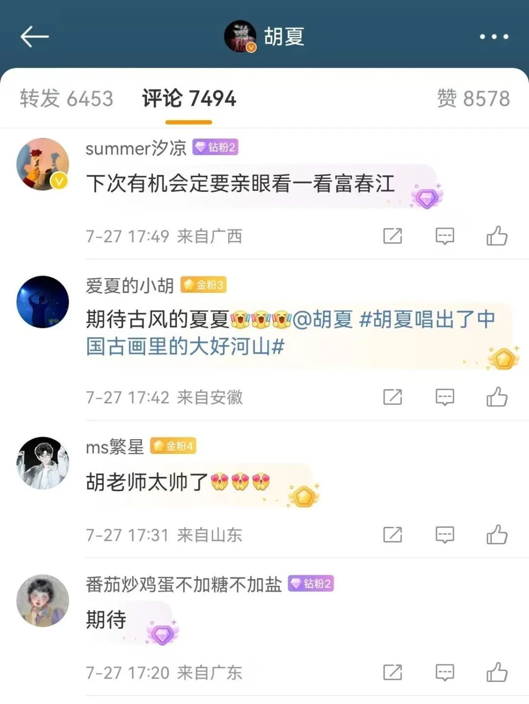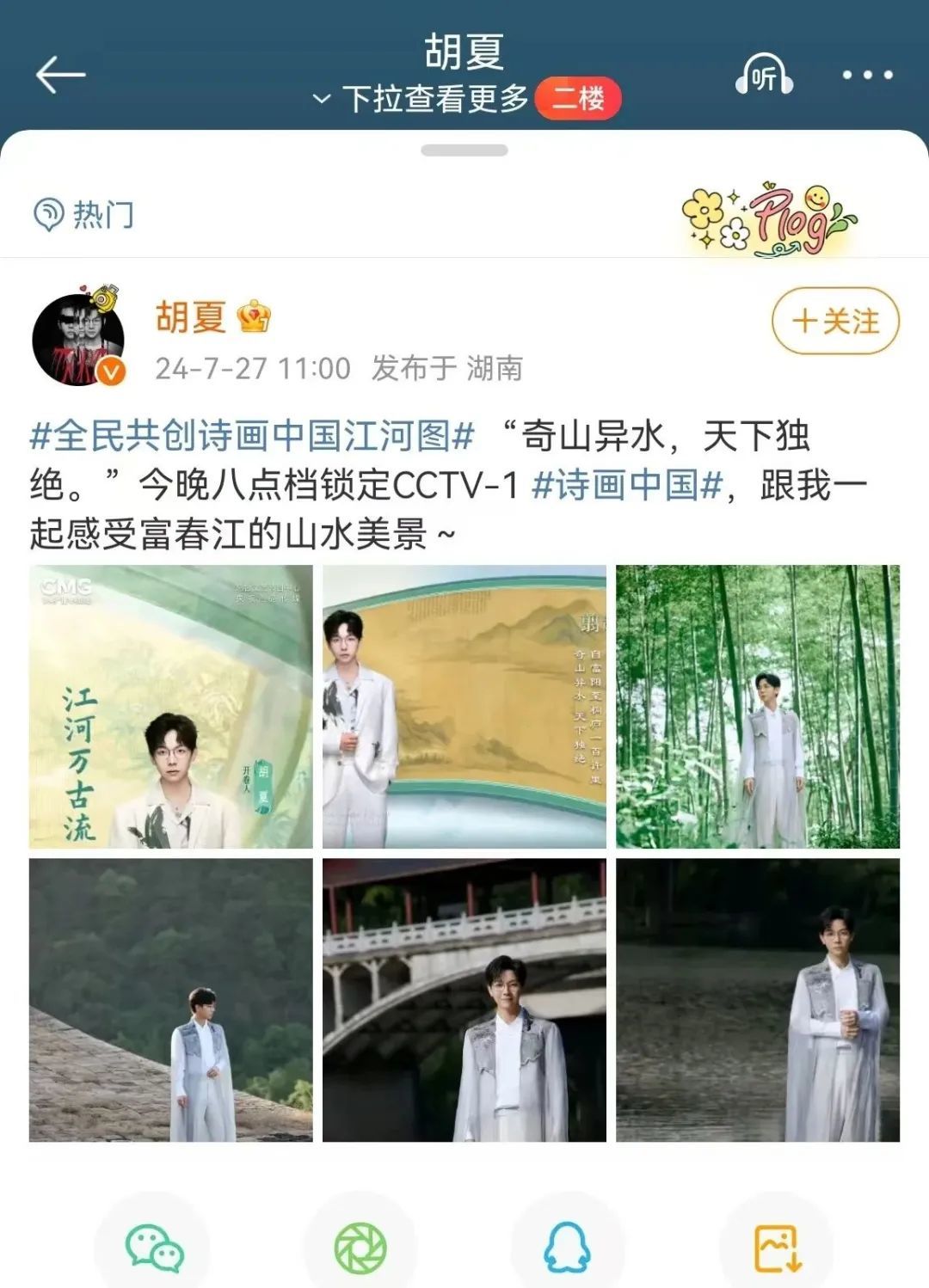 节目播出当天,胡夏连发两条微博,直接成为微博热门话题。其中一条转发的是“央视新闻”的歌曲MV内容,还带上了“这幅画堪称古代旅游博主的攻略”微博话题。