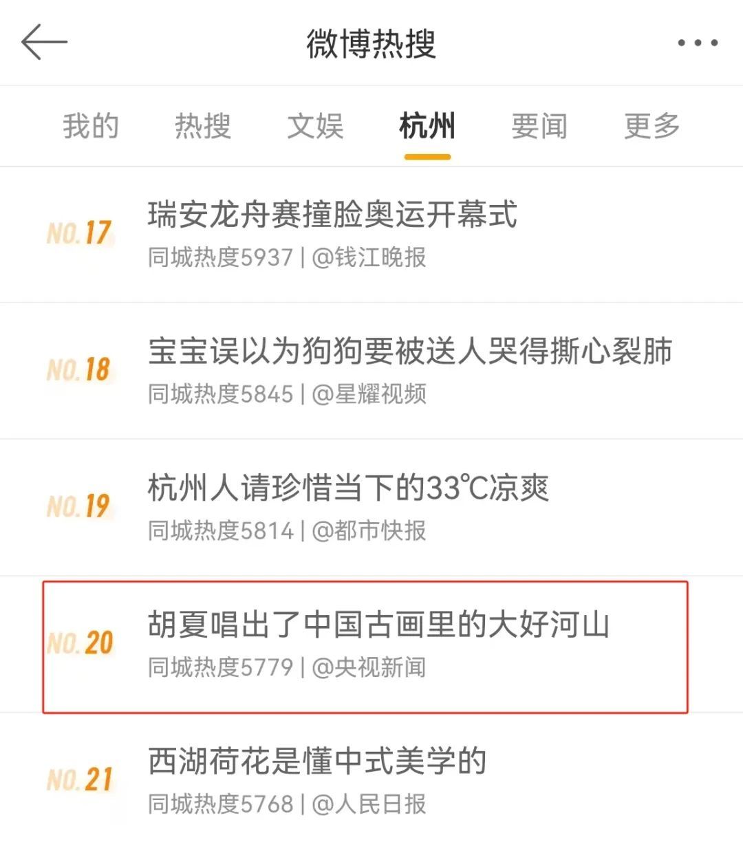 7月27日22时06分,CCTV-1《诗画中国》第二季第10期如约而至,在这期节目中,歌手胡夏作为首位开卷人,前往富春山水间,打开明代画家项圣谟的《翦越江秋图》。当晚,“胡夏唱出了中国古画里的大好河山”冲上微博热搜榜。