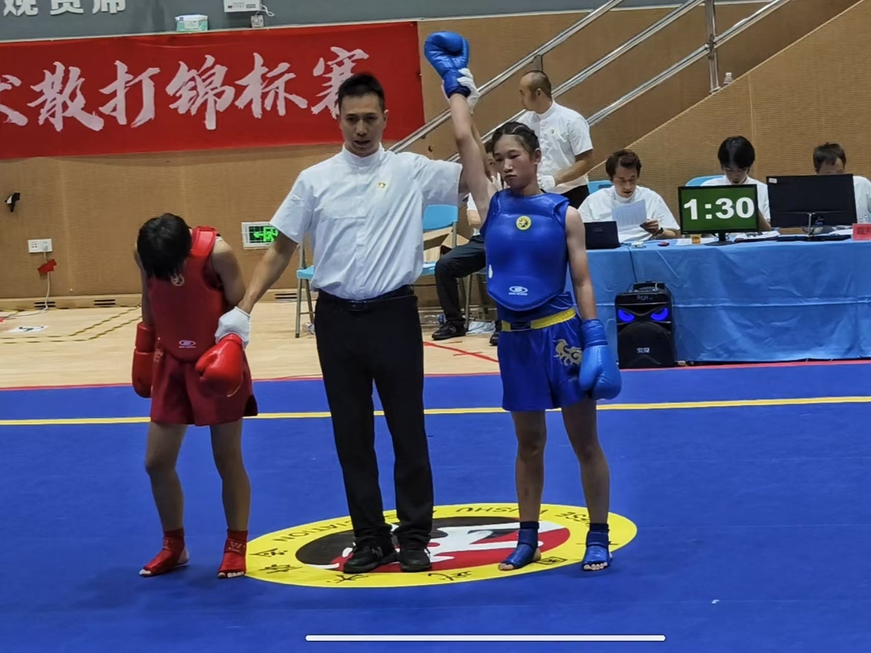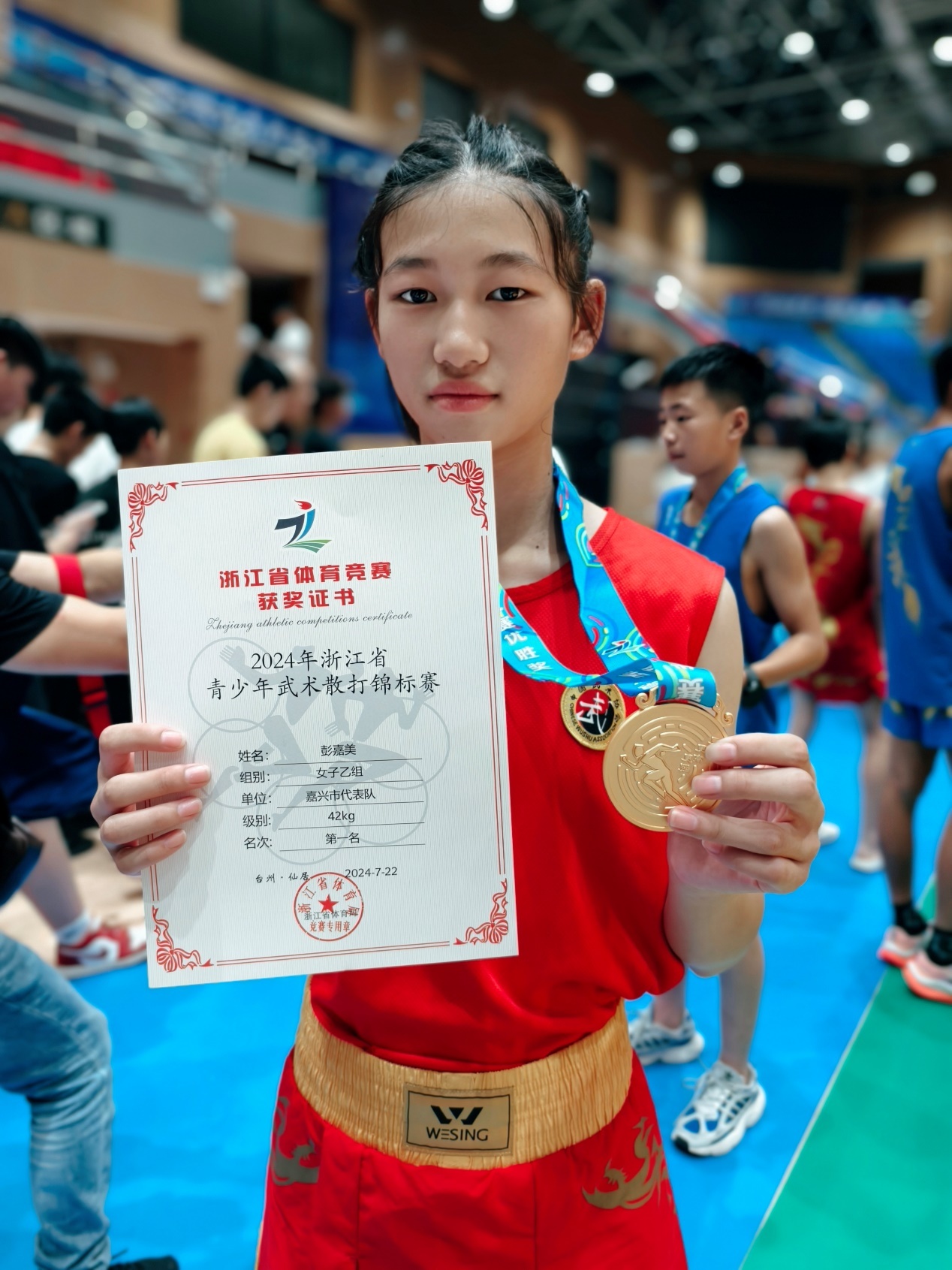 在这5年时间里,彭嘉美的拳法、腿法、摔法、力量、柔韧、协调、爆发力,都被精雕细琢了一遍。“功夫不负有心人”,彭嘉美在多项比赛中,获得不错的成绩:2022年嘉兴市青少年武术套路(散打)锦标赛女子甲组42公斤级第一名、嘉兴市第十届运动会武术散打选拔赛女子组45公斤级第一名、嘉兴市第十届运动会武术散打女子组45公斤级第一名、2023年浙江省青少年武术散打锦标赛女子乙组42公斤级第一名等荣誉。今天,她的荣誉榜上又添了一项新的成就。