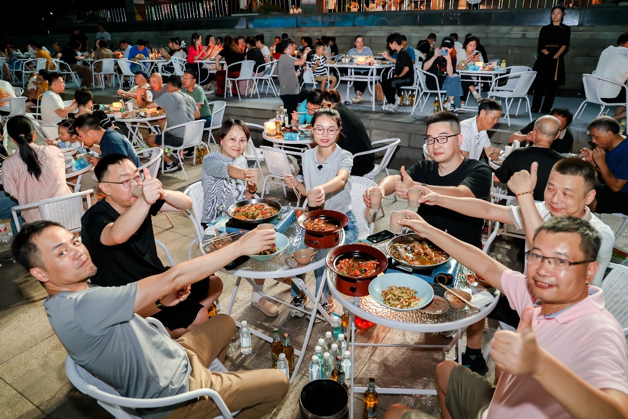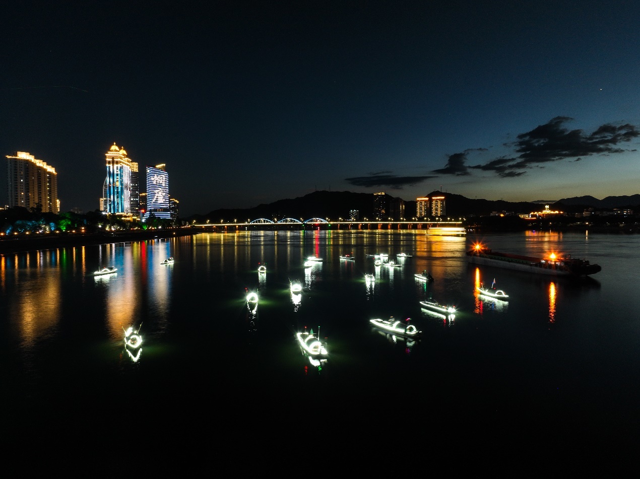 微风阵阵催人醉,江鲜盈盈飘鲜香。“3、2、1”随着倒计时结束,富春江上30艘渔船及富春未来号游轮号角齐鸣,灯光闪烁,一场荟萃江鲜美食、文化、旅游诸多元素的“美食+”文化盛会璀璨上演,点燃了桐庐盛夏之夜。 (通讯员 徐文静 桐庐县文广旅体局供图)