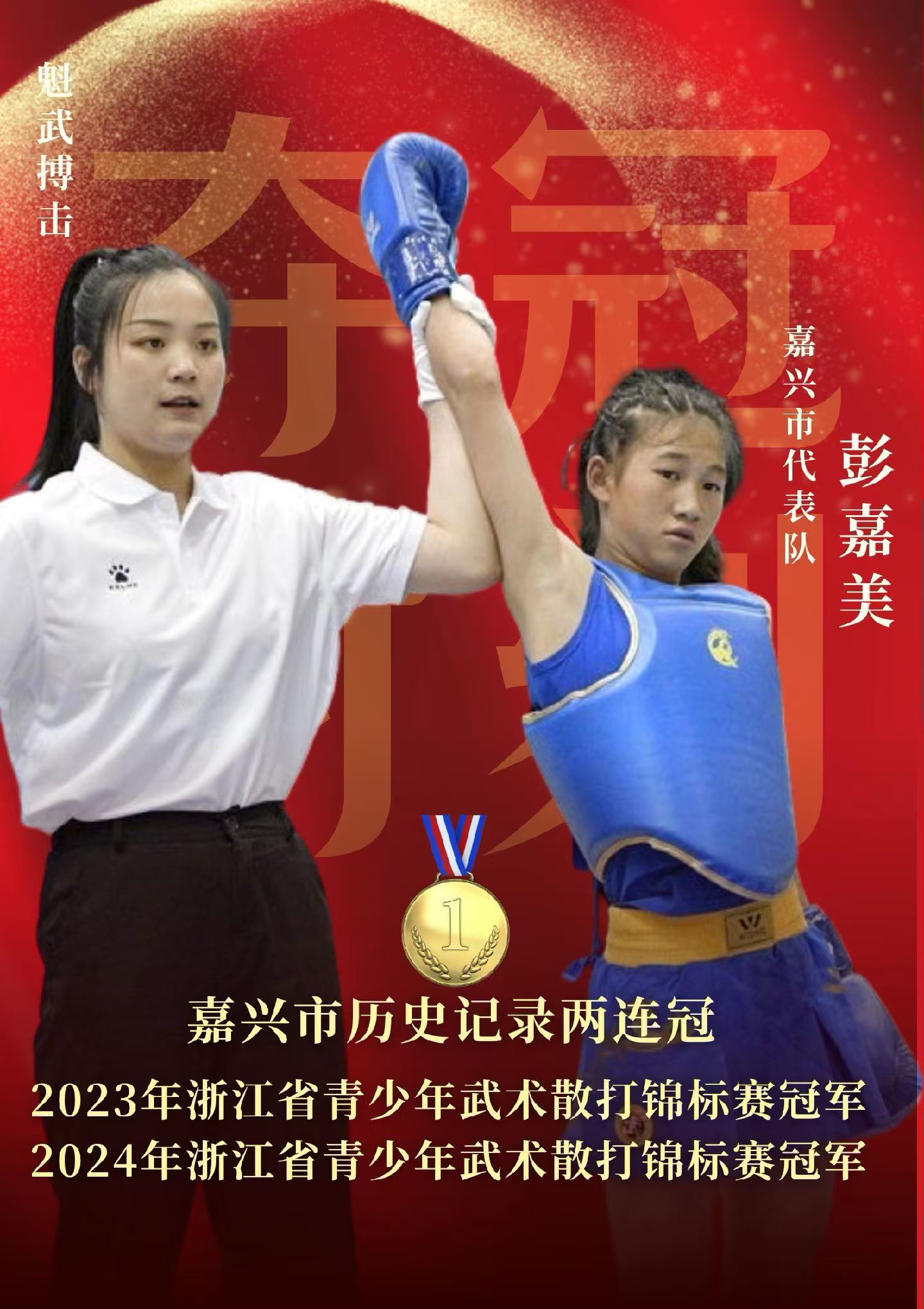 张魁总教练的弟子在2024年浙江省青少年武术散打锦标赛中15岁的“小将”——彭嘉美勇夺冠军!这是彭嘉美连续两届夺金并刷新了嘉兴历史记录!