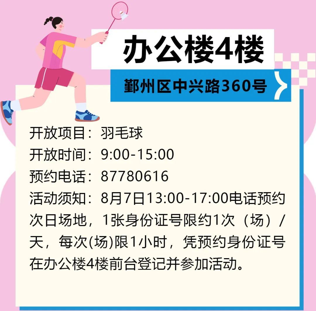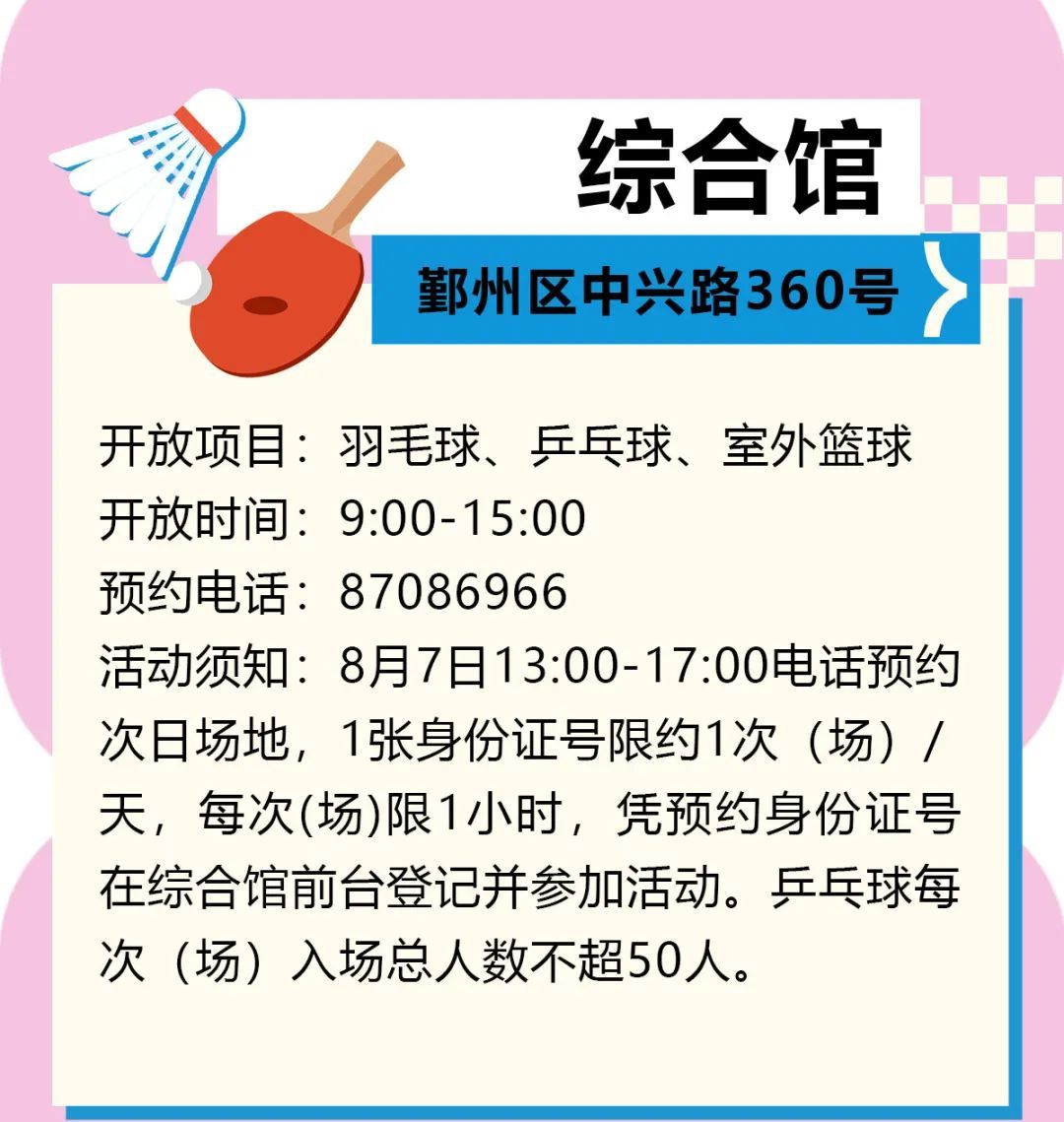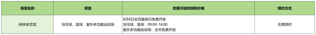 乒乓球馆、篮球馆、羽毛球馆、健身馆,运动健身项目各场馆免费开放。