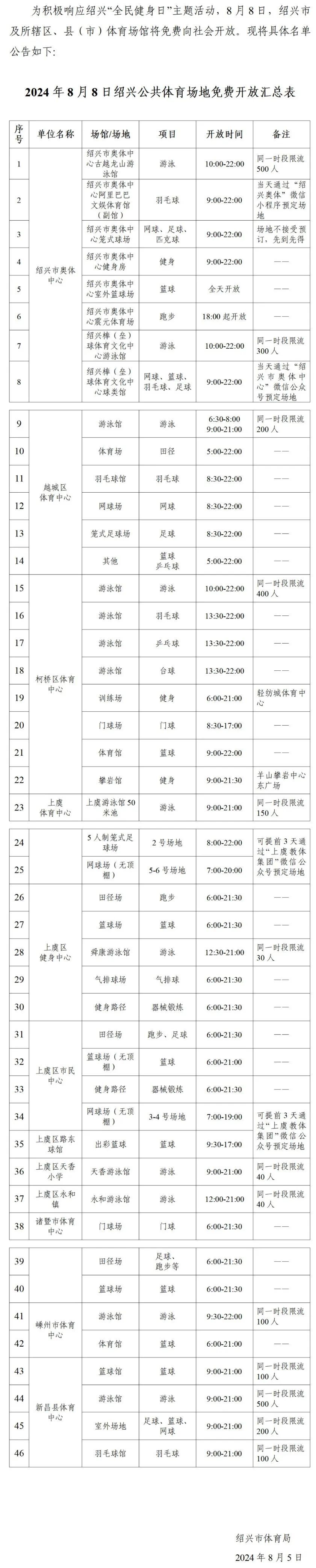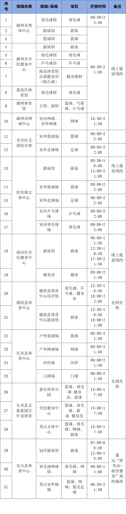 8月8日,湖州这些公共体育场馆将面向市民朋友免费开放。