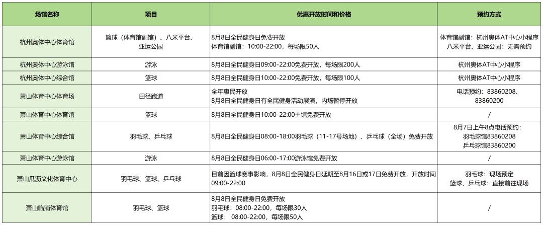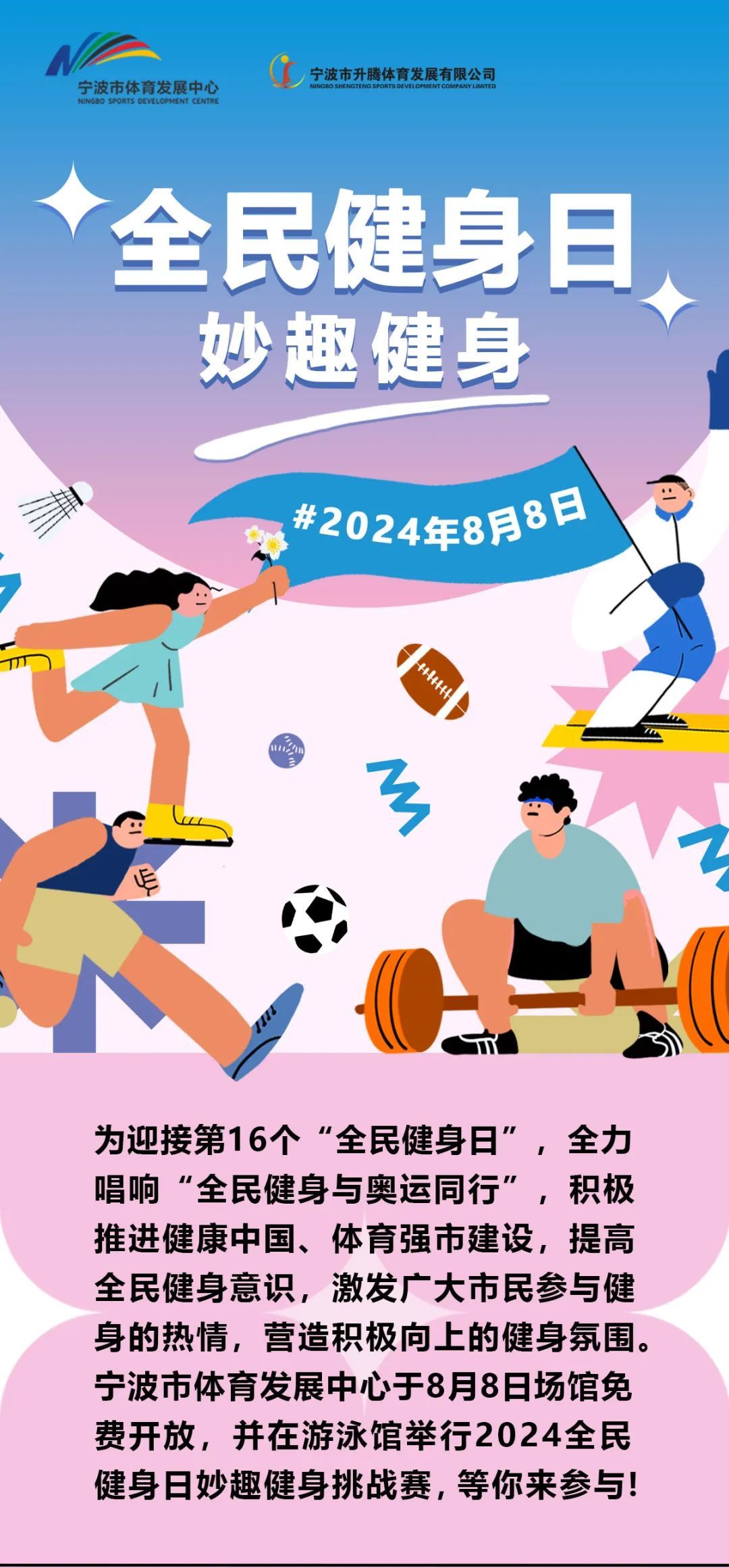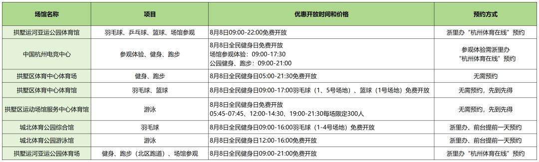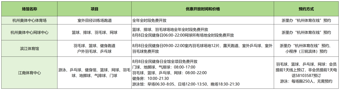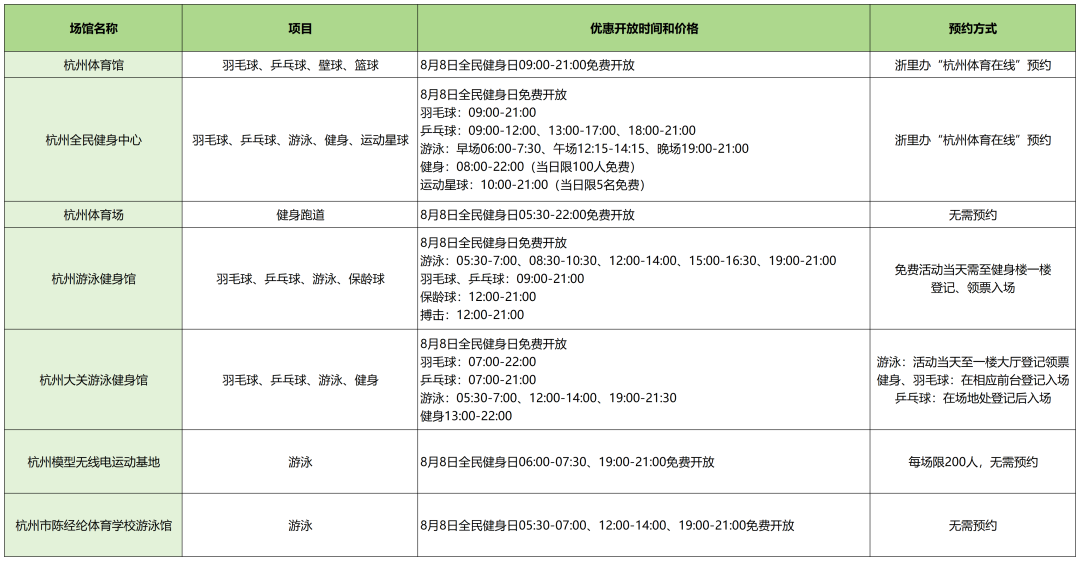今年8月8日是我国第16个“全民健身日”。这一天,浙江各地的体育场馆将实行全时段、全项目惠民开放。