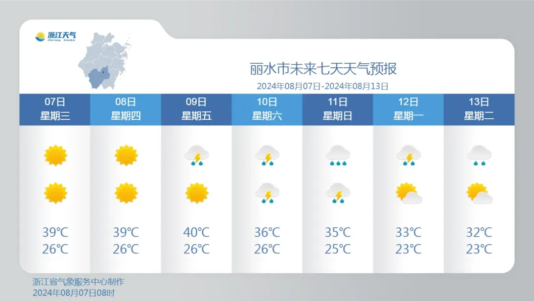 不过,立秋并不等于入秋。立秋只是进入名义上的秋天,气象学以连续5天的日平均气温降到22℃以下作为秋季开始。接下来几天,浙江高温酷暑继续,40℃+依旧密集。