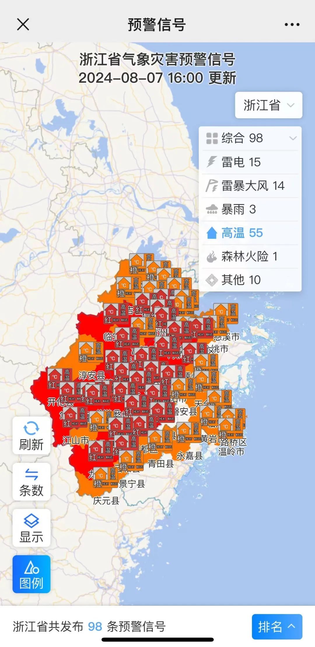 早上9点刚过,浙江就有35℃的高温冒头,且一个接一个,开始一场冲刺并超越40℃的大比拼。7日16:00,浙江共发布55条高温预警信号。