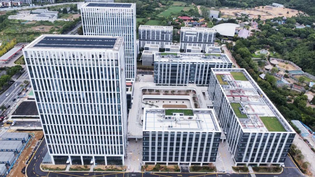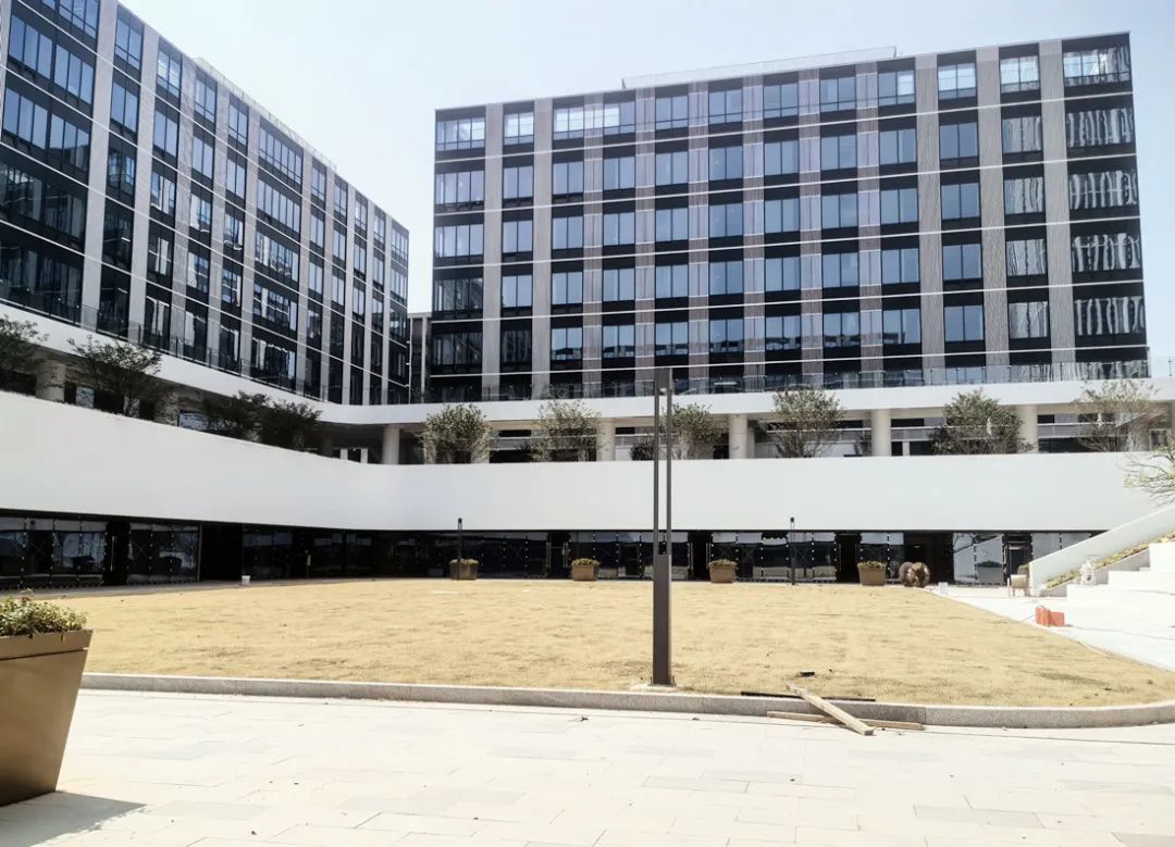 园区入口区域仍有少量施工,右手边是施工人员宿舍。再往前走,可见一座高4层的会议中心,外部用黑色幕墙包裹,当下也是项目部所在,交付后还将打造园区展厅。会议中心左右两侧各立着一幢高18层的大楼,均以白色打底、用黑色格栅或铝板或玻璃点缀其间;高楼旁都有一幢6层高的建筑。会议中心对面是一幢同样高6层、但纵向跨度达102.8米的楼,其中五六两层是浙江中医药大学富阳研究院的GMP车间实验室(通常也称GMP无菌实验室),内部有10万级洁净度要求的洁净室。
