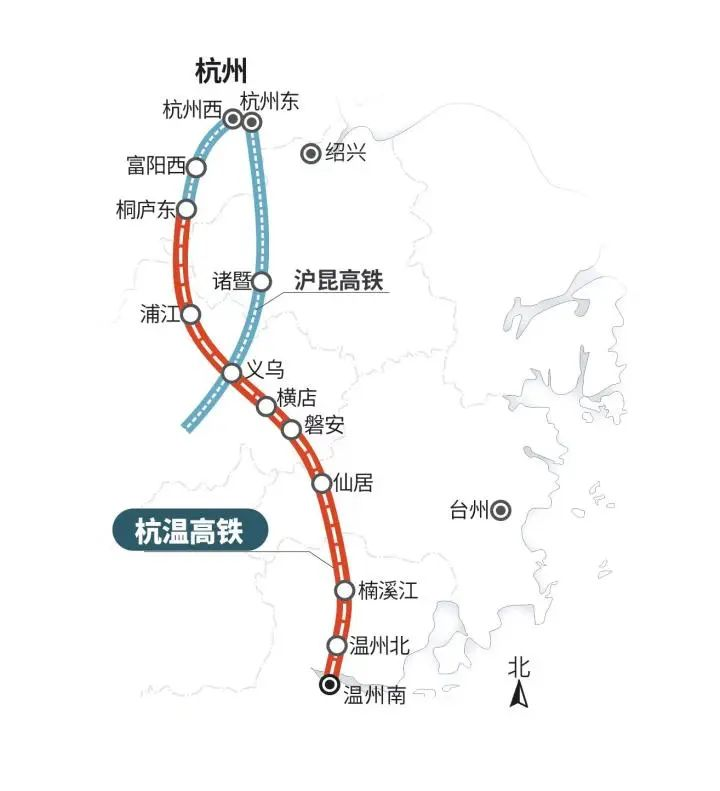 旅客可从温州南站、温州北站出发,经杭温高铁直达杭州西站,使温州至杭州的通行时间缩短至约1小时。