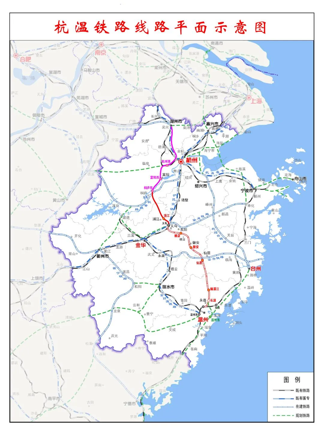 杭温高铁在桐庐东站与合杭高铁湖杭段连接,在义乌站与沪昆高铁连接,在温州北站与杭深铁路连接,是长三角城际铁路网的重要组成部分。
