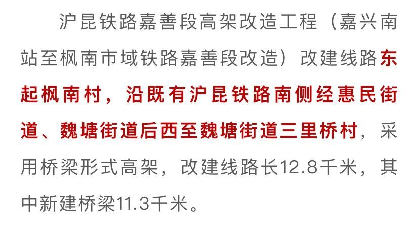 沪昆铁路嘉善段高架改造工程(嘉兴南站至枫南市域铁路嘉善段改造)用地近日获国务院批准。项目用地共计811亩,其中新增建设用地673亩,新增建设用地指标全额国家核销保障。