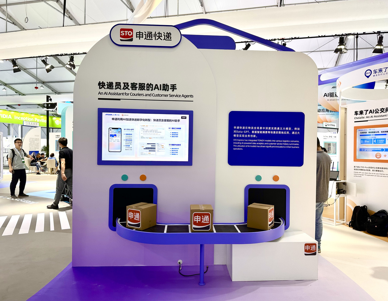 物流工作流程众多、环环相扣、需求多样、数据庞杂。小哥在处理快递时,难免会被复杂的信息干扰了工作进度。于是,就有了AI助手的用武之地。 “AI助手建立在阿里云通义大模型之上,通过大模型强大的交互能力,AI助手能跟踪实操进度,提供操作建议,整理好核心内容并提供智能检索服务。这让网点的信息查询、管理等工作变得更为高效快捷。” 申通快递展区讲解员介绍道。