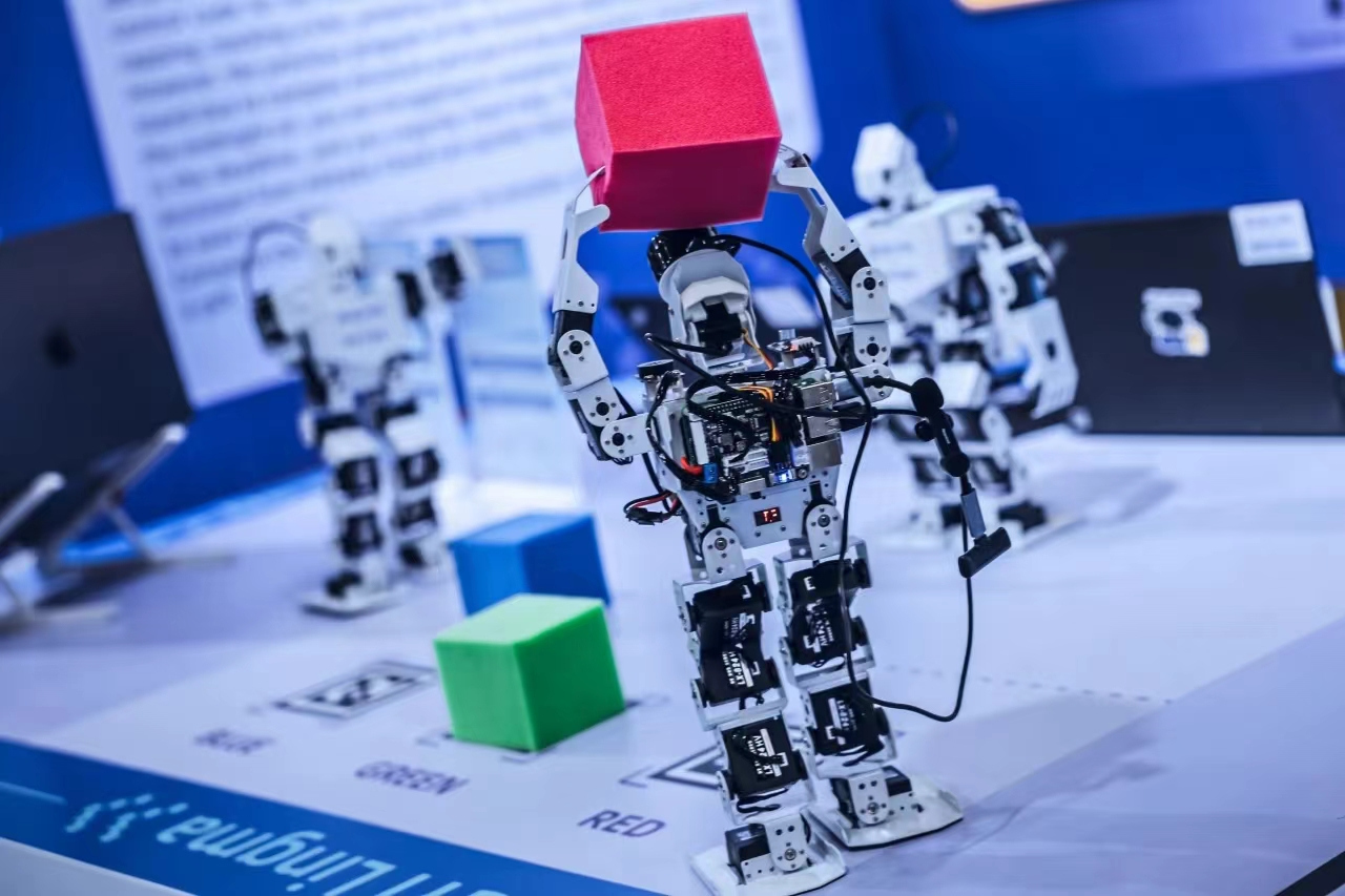 “我们用最新的大模型技术,给机器人吹了口‘仙气’,注入了灵魂。”第一次参展的个人开发者(极客)、同济大学研究生张子豪,在云栖大会上展示了他开发的小型人形机器人。指令一下,这个迷你版人形机器人就能乐此不疲地搬运红绿“砖块”、花式踢球。