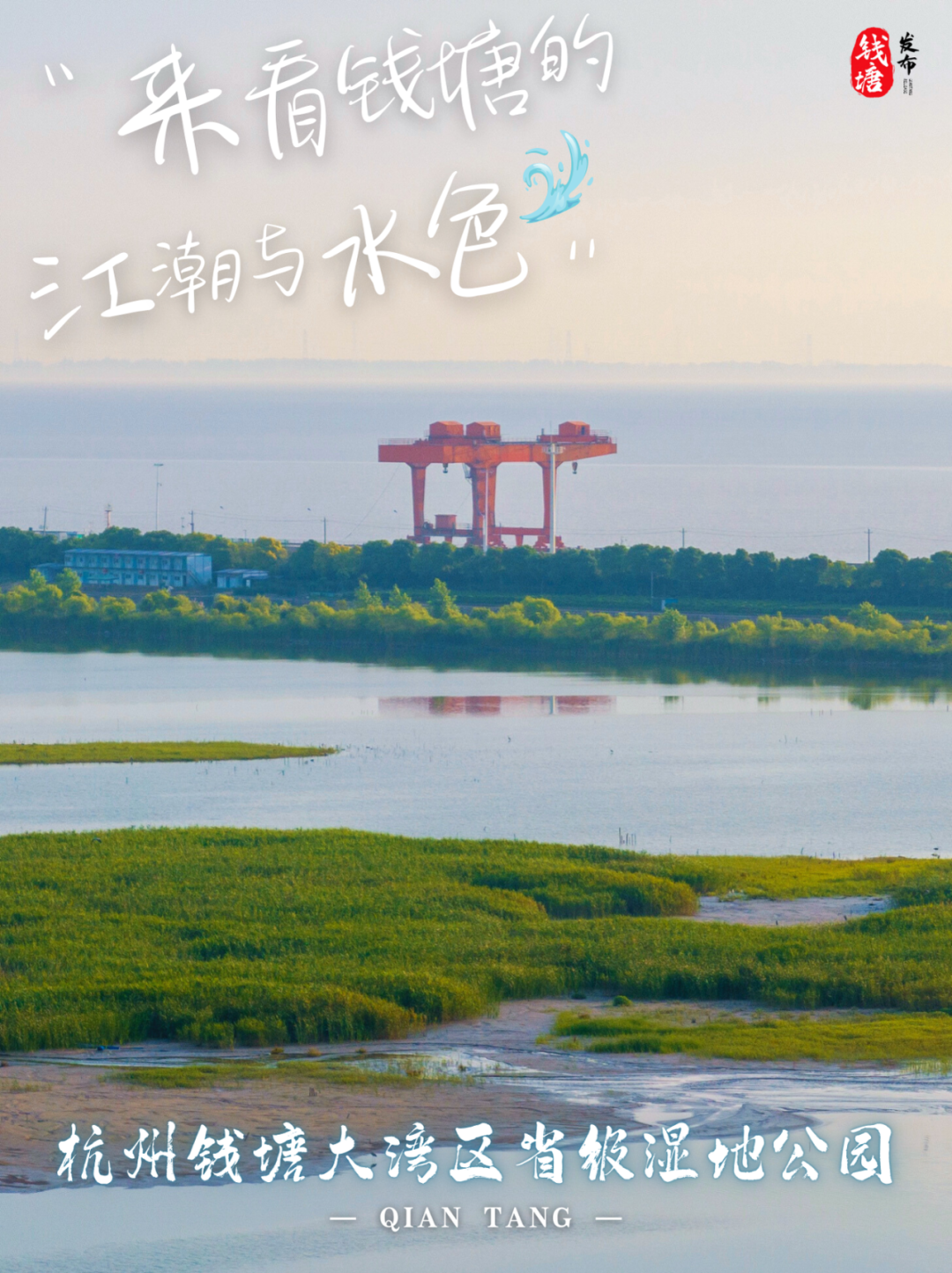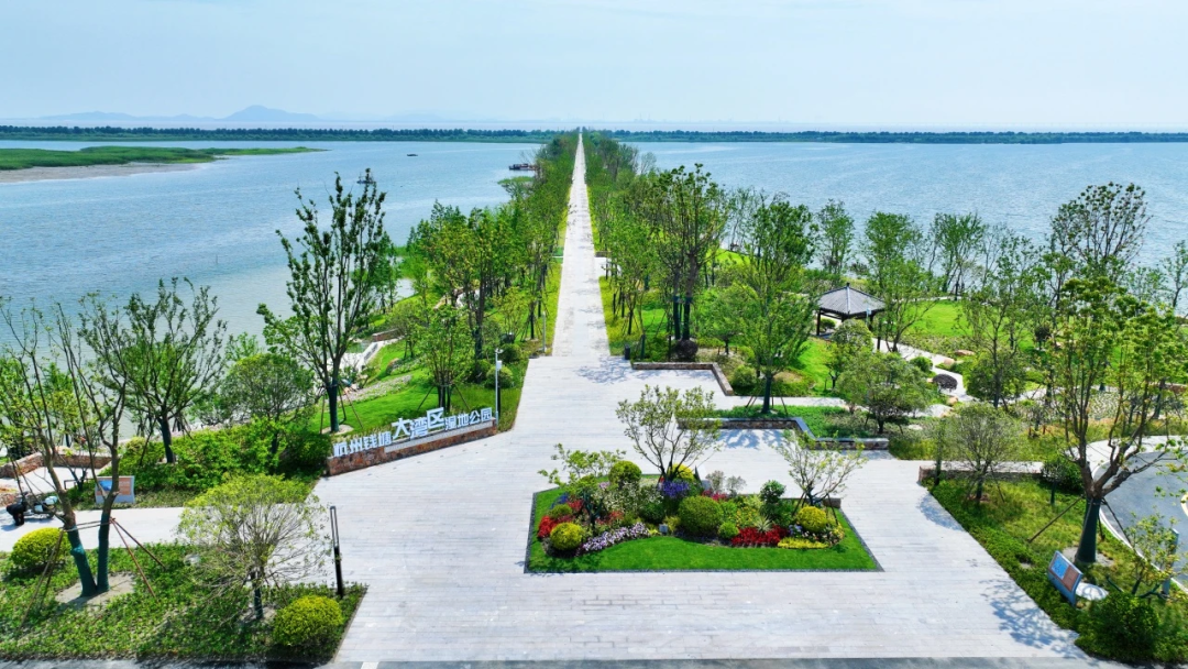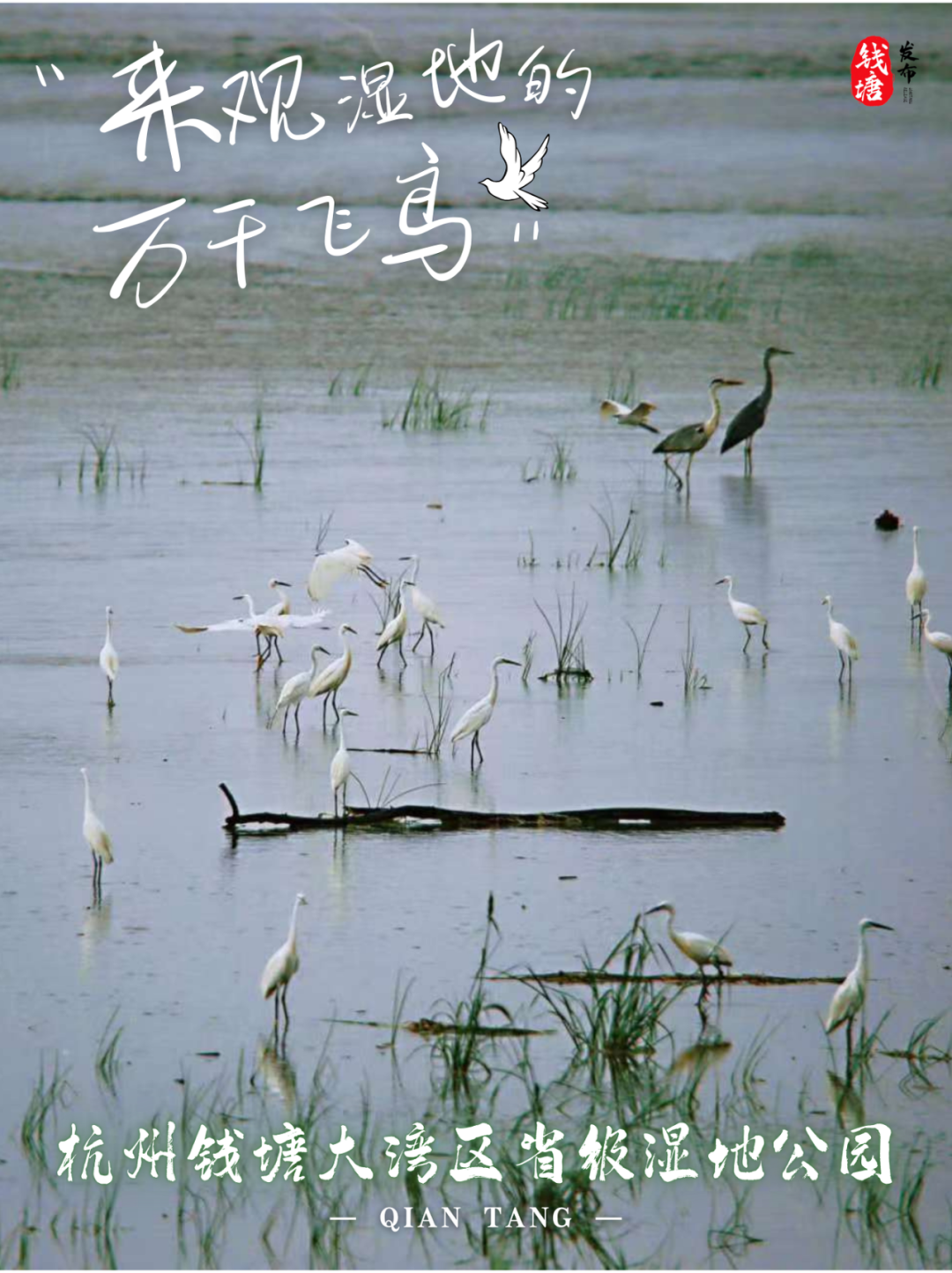 杭州钱塘大湾区省级湿地公园位于钱塘区二线海塘,是三江两岸景观廊道的终端,杭州东部生态带的核心区域,东亚-澳大利西亚候鸟迁徙路线的重要中转站。公园规划面积约44平方公里,湿地率高达99.56%。