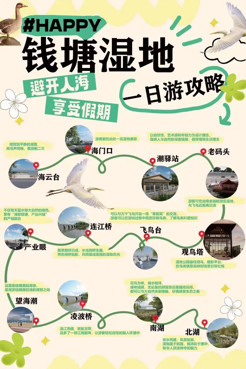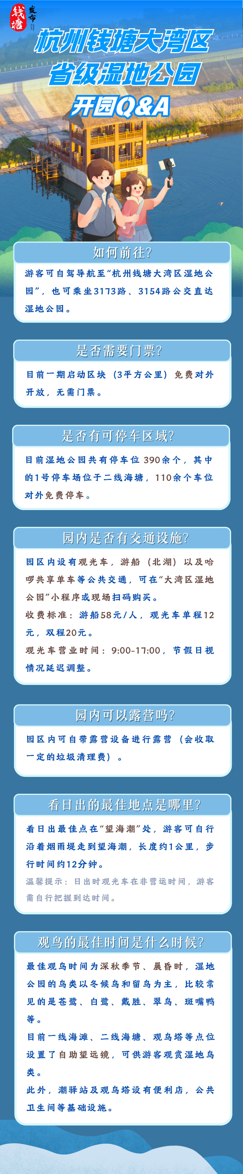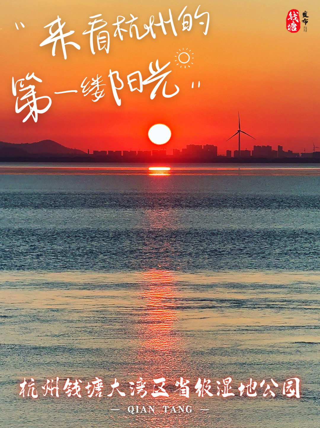 杭州钱塘大湾区省级湿地公园位于钱塘区二线海塘,是三江两岸景观廊道的终端,杭州东部生态带的核心区域,东亚-澳大利西亚候鸟迁徙路线的重要中转站。公园规划面积约44平方公里,湿地率高达99.56%。