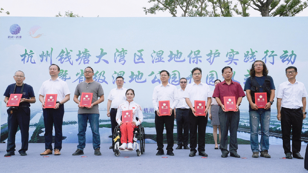 为了让湿地保护的生态理念更加深入人心,进一步促进湿地生态保护和恢复,推动钱塘城市与湿地共生共融,活动现场为杭州第4届亚残运会皮划艇女子KL1级冠军谢毛三、国家林草局华东院规划处处长徐鹏等8位来自体育、生态、教育等领域的湿地宣传保护大使颁发聘书,并为湿地保护志愿者服务队授旗。