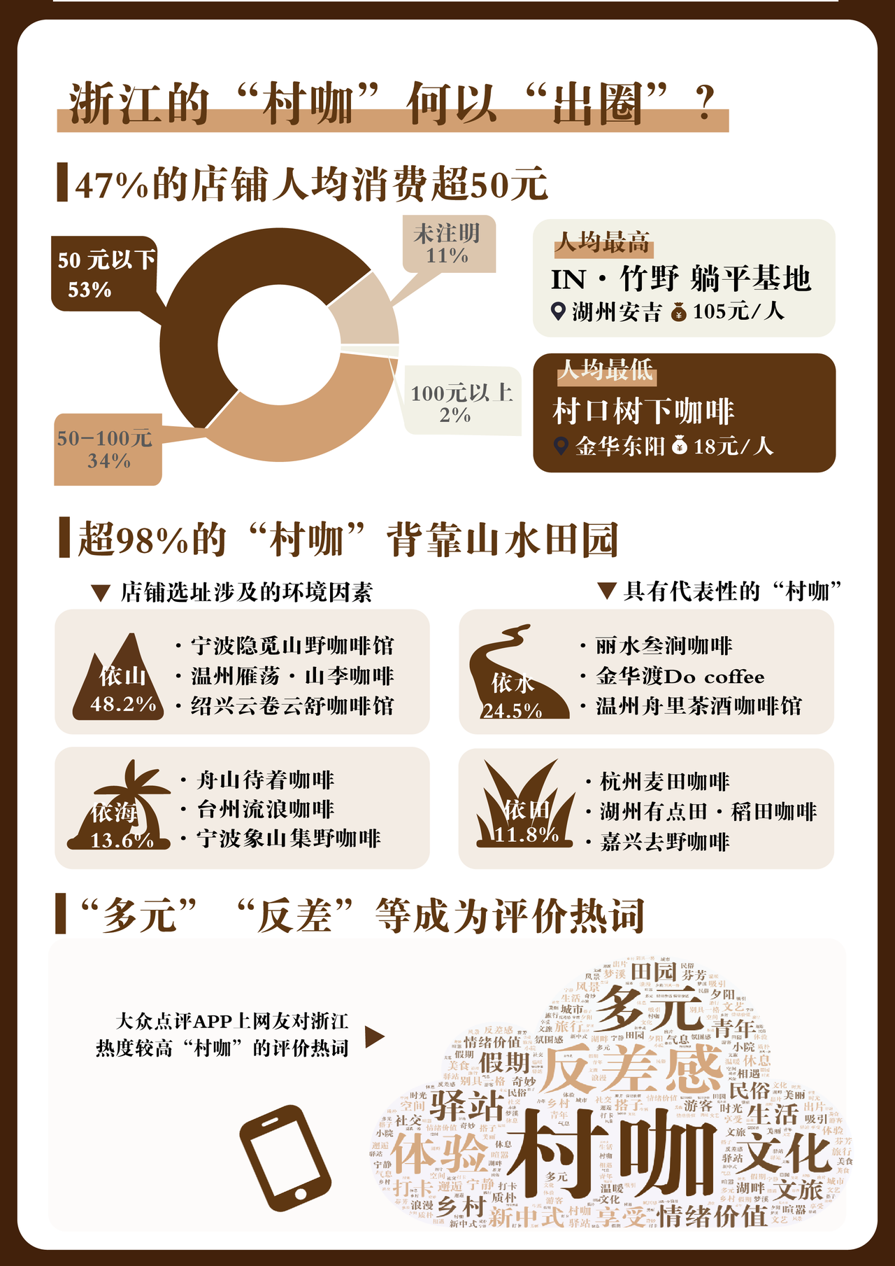 是什么让消费者愿意接受相对较高的价格,不断奔向“村咖”?首先,相比于城市咖啡馆,“村咖”所处的环境更广阔、更多元,浙江“七山一水二分田”和“海岛多”的地理特点,让“村咖”的颜值与格调有了更多可能性。统计发现,上述100余家省内“村咖”中,超98%在选址上依山、依水、依海或依田,绝美的景色也使“出片”“氛围感”等成为网友评论的高频热词。如位于杭州临平一片麦田旁的“麦田咖啡·有风小屋”,每到天气良好的傍晚,麦田和落日便会构成绝美画卷,小红书上与其相关的帖文超7000条。