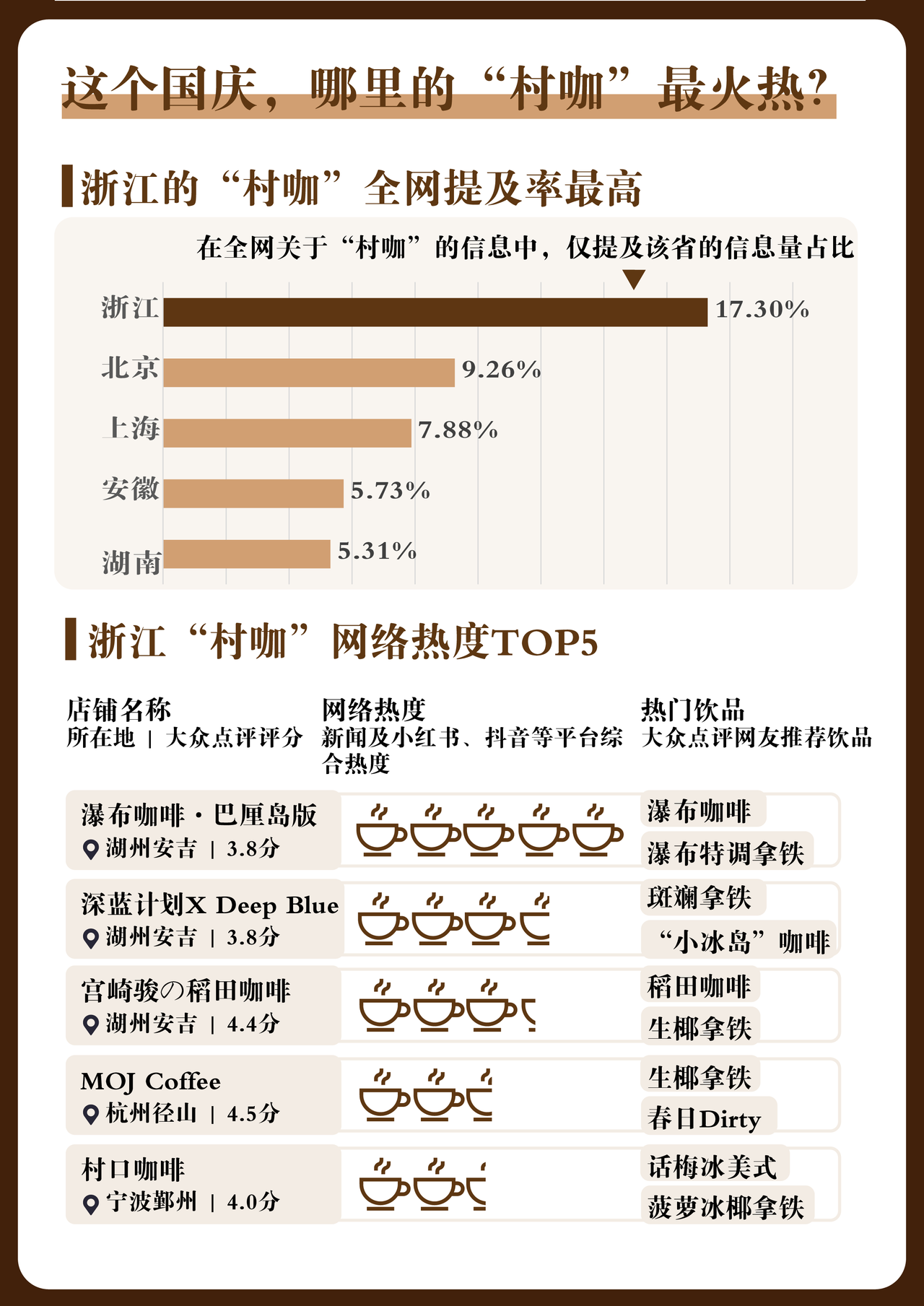 国庆假期期间,10月1日至7日,全网与“村咖”相关信息11496条,其中有近两成信息聚焦浙江,排名全国首位。综合各平台数据,国庆假期,热度排名前五位的浙江省内“村咖”中,湖州安吉包揽前三,背靠三阶瀑布的“瀑布咖啡·巴厘岛版”,曾以8818杯刷新全国单日单店咖啡销售量纪录的“深蓝计划X Deep Blue”,旨在打造“漫画同款”的“宫崎骏の稻田咖啡”……这些“村咖”以游客“打卡”大片等形式,收获无数点赞。