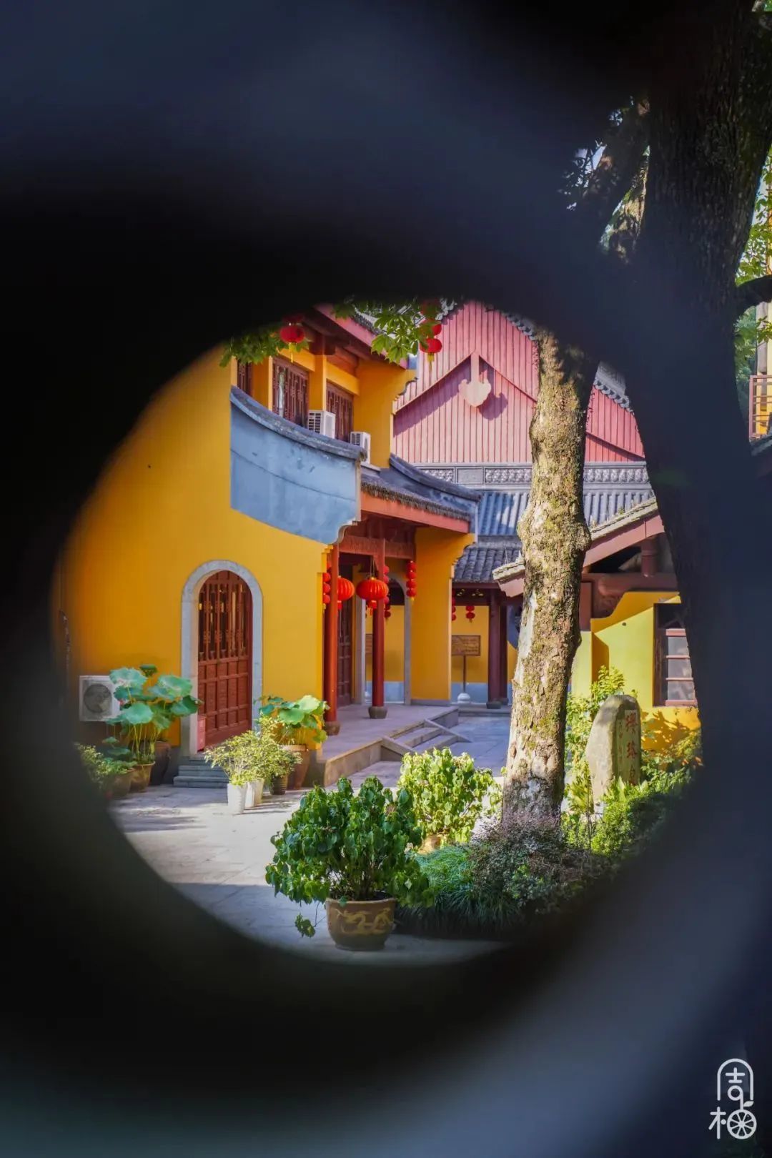 进入寺内右手边走到底,药师殿右侧院内有一棵古老静美的桂花树。桂花的枝丫,配上古寺黄墙和灯笼,禅意十足。