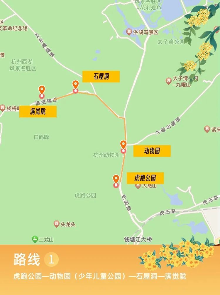 📍路线1: 虎跑公园—动物园(少年儿童公园)—石屋洞—满觉陇