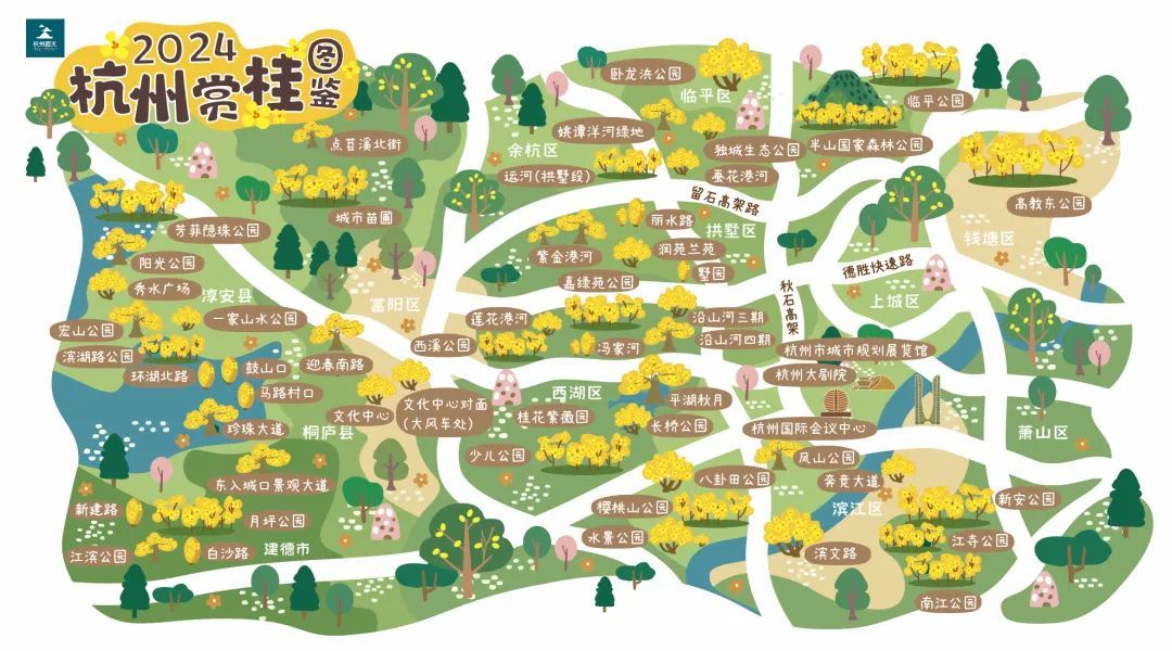 杭州有多少桂花?据不完全统计,目前杭州市桂花数量已达500余万株。这些甜丝丝的黄色小花都藏在哪儿?或许你能在这张《2024杭州赏桂图鉴》中找到答案。