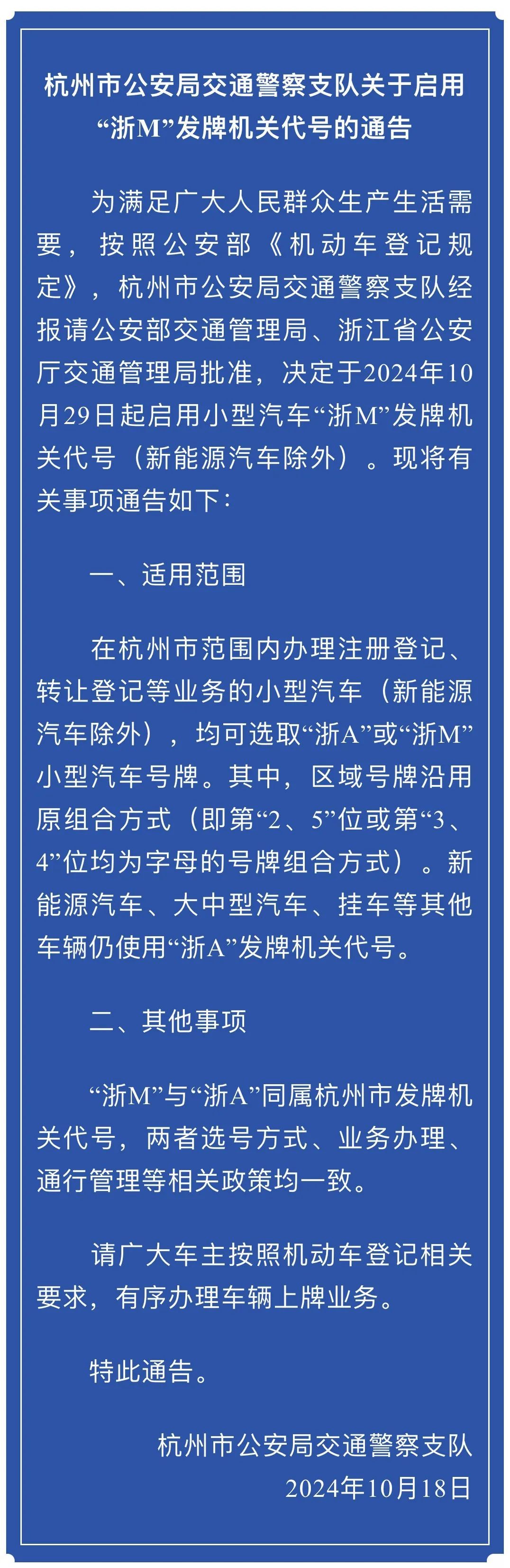 为满足广大人民群众生产生活需要,依据相关法律法规规定,杭州市公安局交警支队报请上级公安机关交通管理部门批准同意,决定于2024年10月29日启用小型汽车(蓝牌)“浙M”发牌机关代号。