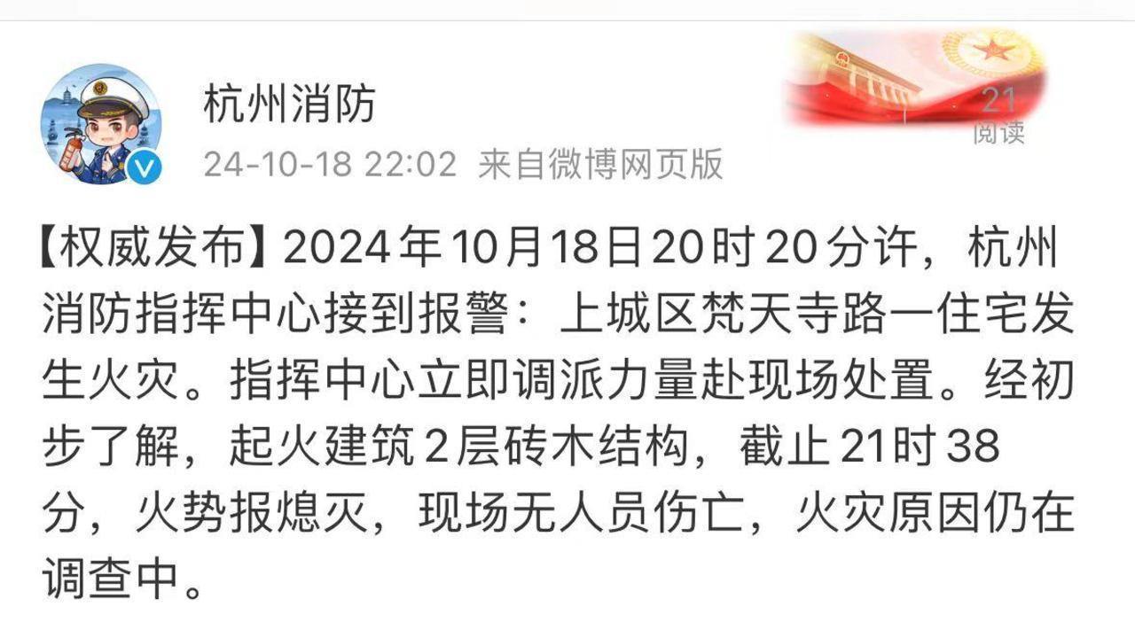 2024年10月18日20时20分许,杭州消防指挥中心接到报警:上城区梵天寺路一住宅发生火灾。指挥中心立即调派力量赴现场处置。经初步了解,起火建筑2层砖木结构,截止21时38分,火势报熄灭,现场无人员伤亡,火灾原因仍在调查中。