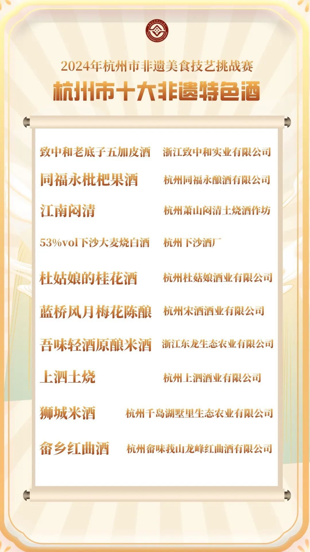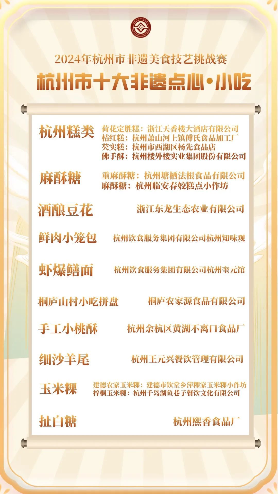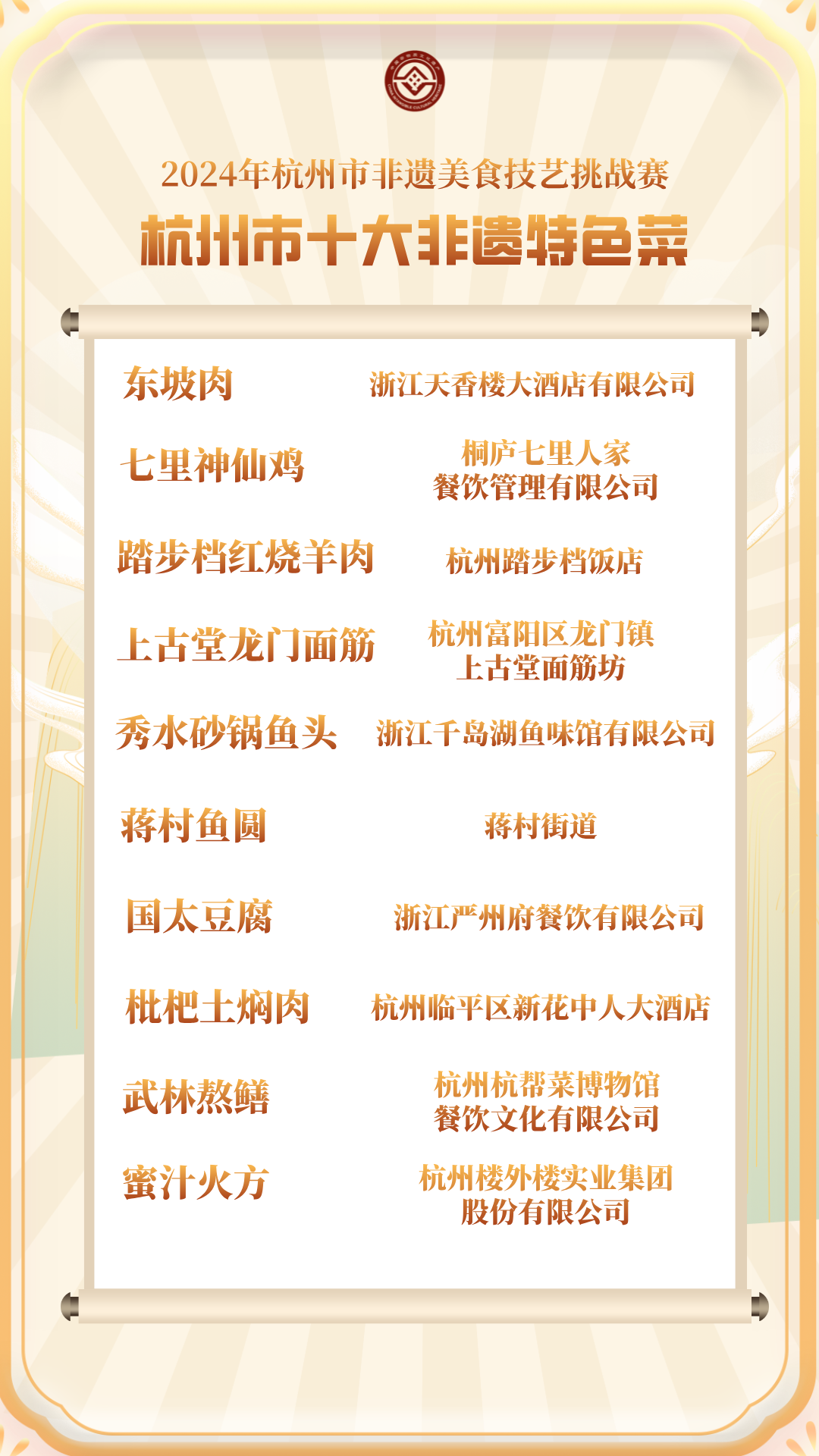 10月19日,现场发布了本次非遗美食技艺挑战赛评出的杭州市十大非遗特色菜、杭州市十大非遗点心(小吃)、杭州市十大非遗特色酒、杭州市非遗美食伴手礼创意设计奖及杭州市非遗美食(传统菜肴)薪传奖、杭州市非遗美食伴手礼创意设计大赛优秀奖。(点击这里查看更多详细内容)