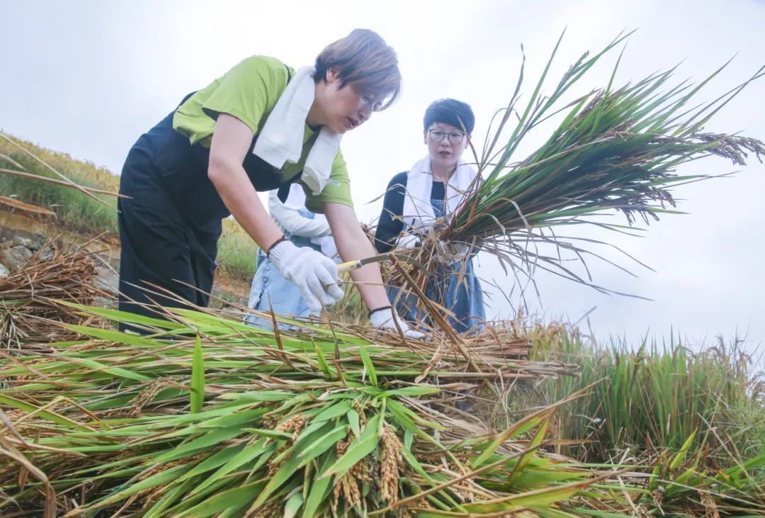10月20日上午,在千岛湖镇青溪村长岭上艺术梯田内,割稻体验活动开展得如火如荼。市民、游客、党员、学生,大家一起走进田间地头,收割稻谷,在一镰一镰的挥动中回归传统、亲近自然,深刻体会每一粒粮食的来之不易。