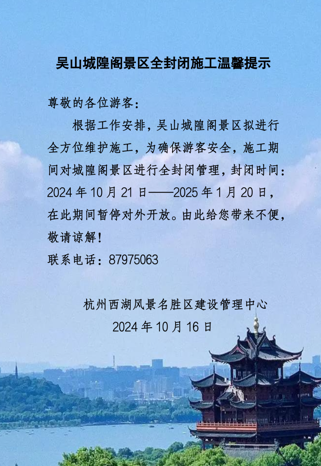 杭州标志性建筑之一吴山景区城隍阁于10月21日起进行封闭修缮,预计将于2025年1月20日完工,在春节期间重新开放。今天是城隍阁封闭修缮的第一天,小微要提醒大家:修缮期间,市民朋友别跑空了哦!