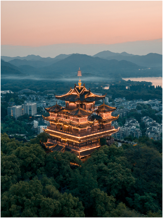 整体造型为南宋风格,气势非凡,通过各层飞檐翘角的衬托,呈现凌空飞升的气势,给人以“龙飞凤舞到钱塘”的联想。建成以后,即成为西湖乃至杭州的地标性建筑,作为鸟瞰西湖、钱塘江以及城市景观的极佳制高点一直深受市民游客的喜爱。