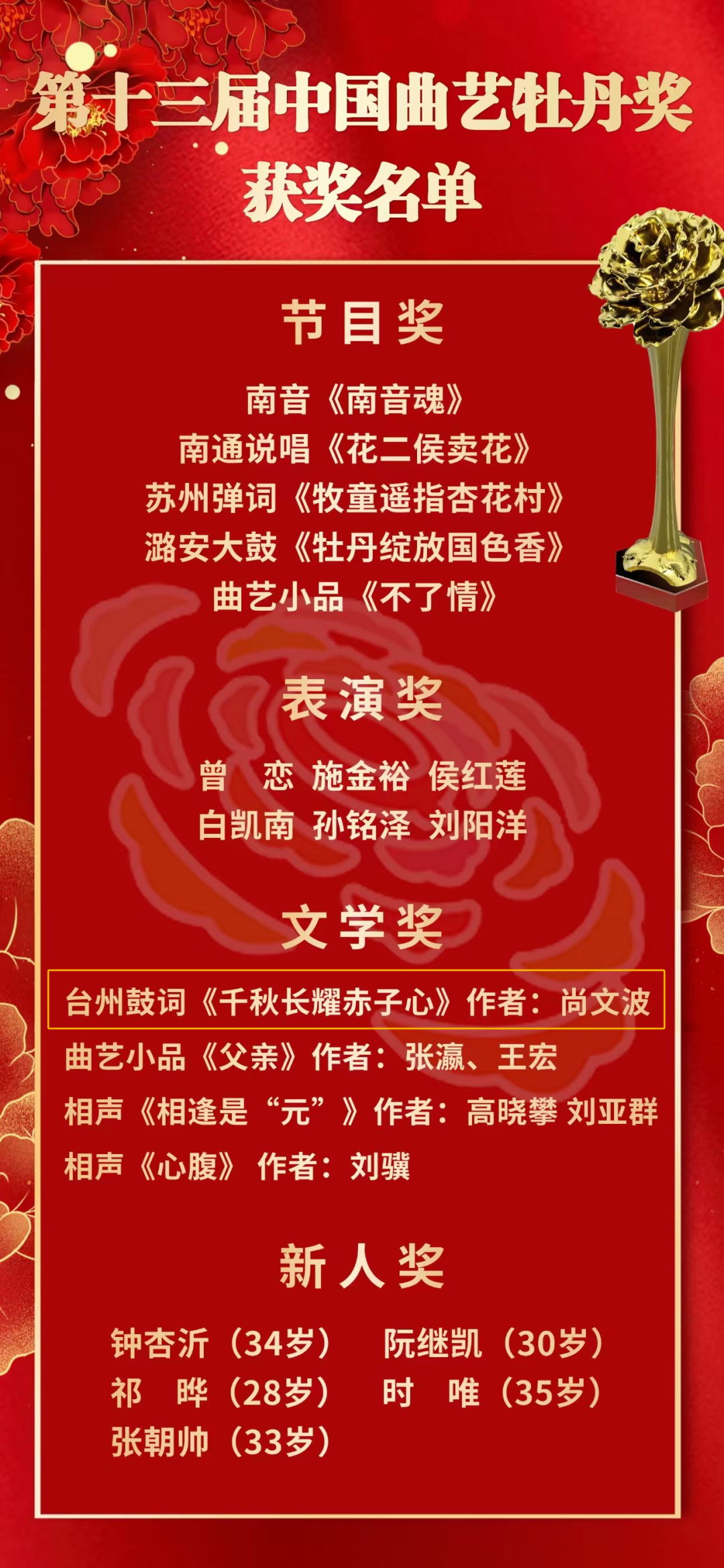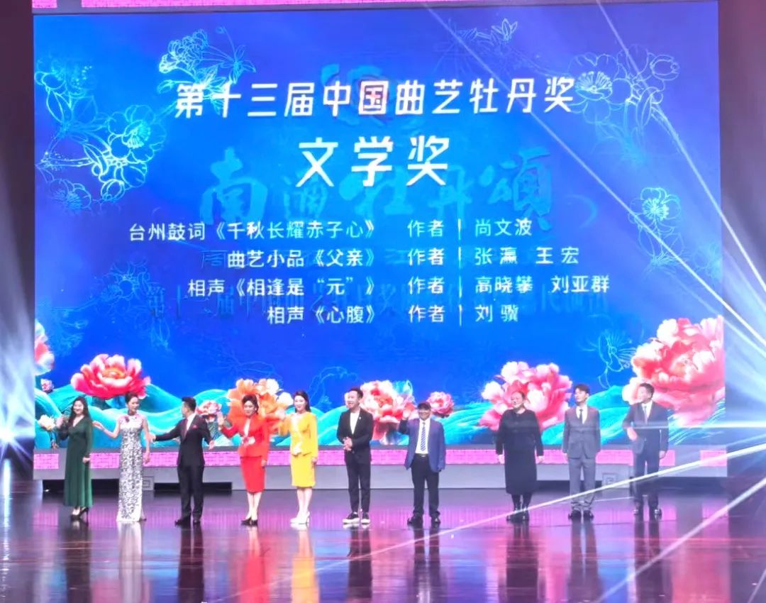 经过10余个月的层层选拔,激烈角逐,由台州市曲艺家协会主席尚文波创作的台州鼓词《千秋长耀赤子心》荣获第十三届中国曲艺牡丹奖文学奖,成为台州首个荣获中国曲艺最高奖牡丹奖的作品。