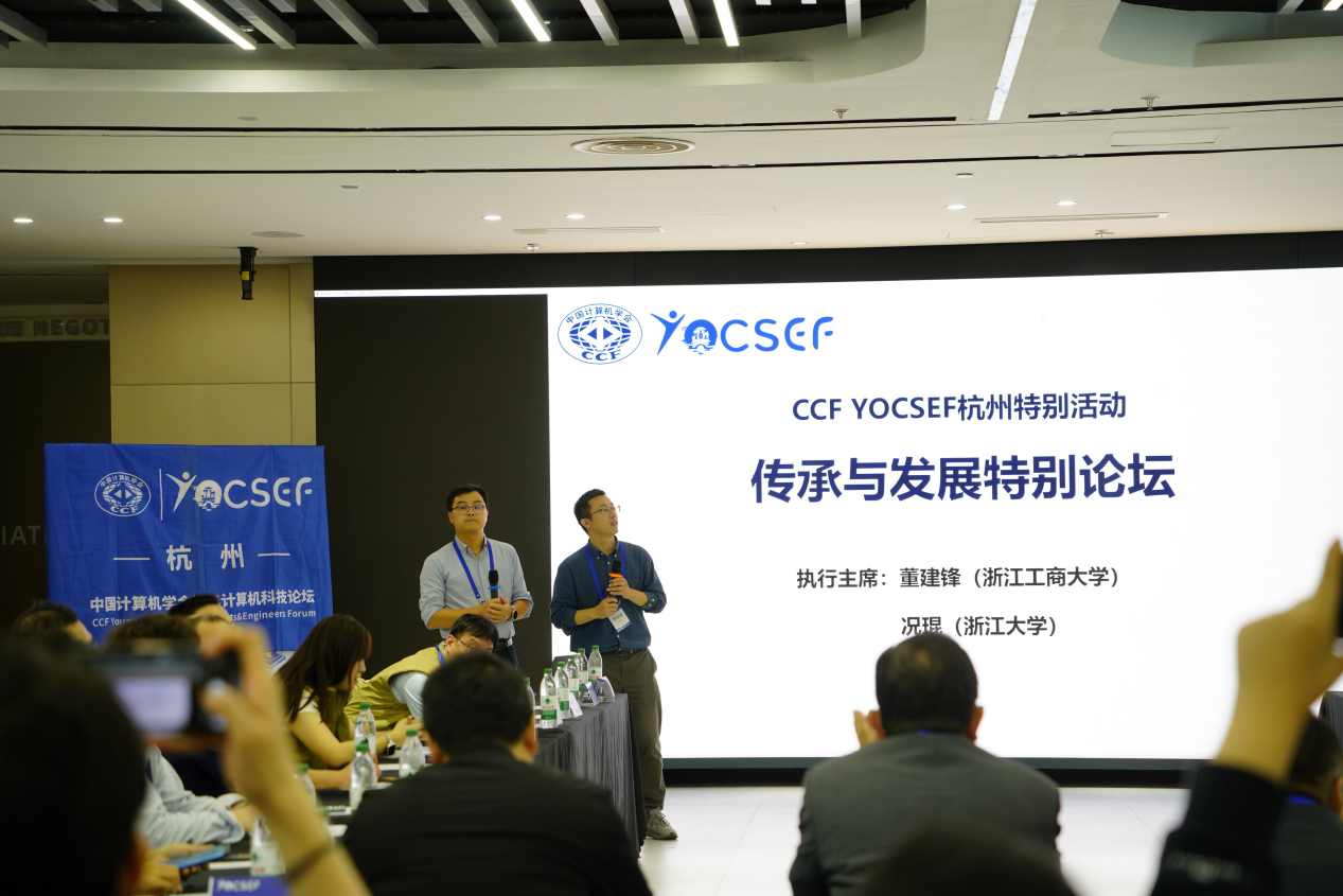 “传承与发展”特别论坛,由YOCSEF杭州主席董建锋与YOCSEF杭州副主席况琨共同主持。YOCSEF杭州与总部、各个分论坛、高校和企业的同仁们一起共襄盛举,共同探讨CCF YOCSEF的传承与发展。董建锋与况琨对到场的各位嘉宾表示感谢,并回顾了YOCSEF杭州的发展历程,同时给出了本次论坛的核心目标,即围绕着YOCSEF的传承与创新展开思辨讨论,探讨“YOCSEF 杭州目前存在的最大问题及对策”、“老主席毕业之后何去何从,怎么继续发光发热?”以及“YOCSEF分论坛大比武制度优势如何最大化?是否还有提升空间?”等议题。