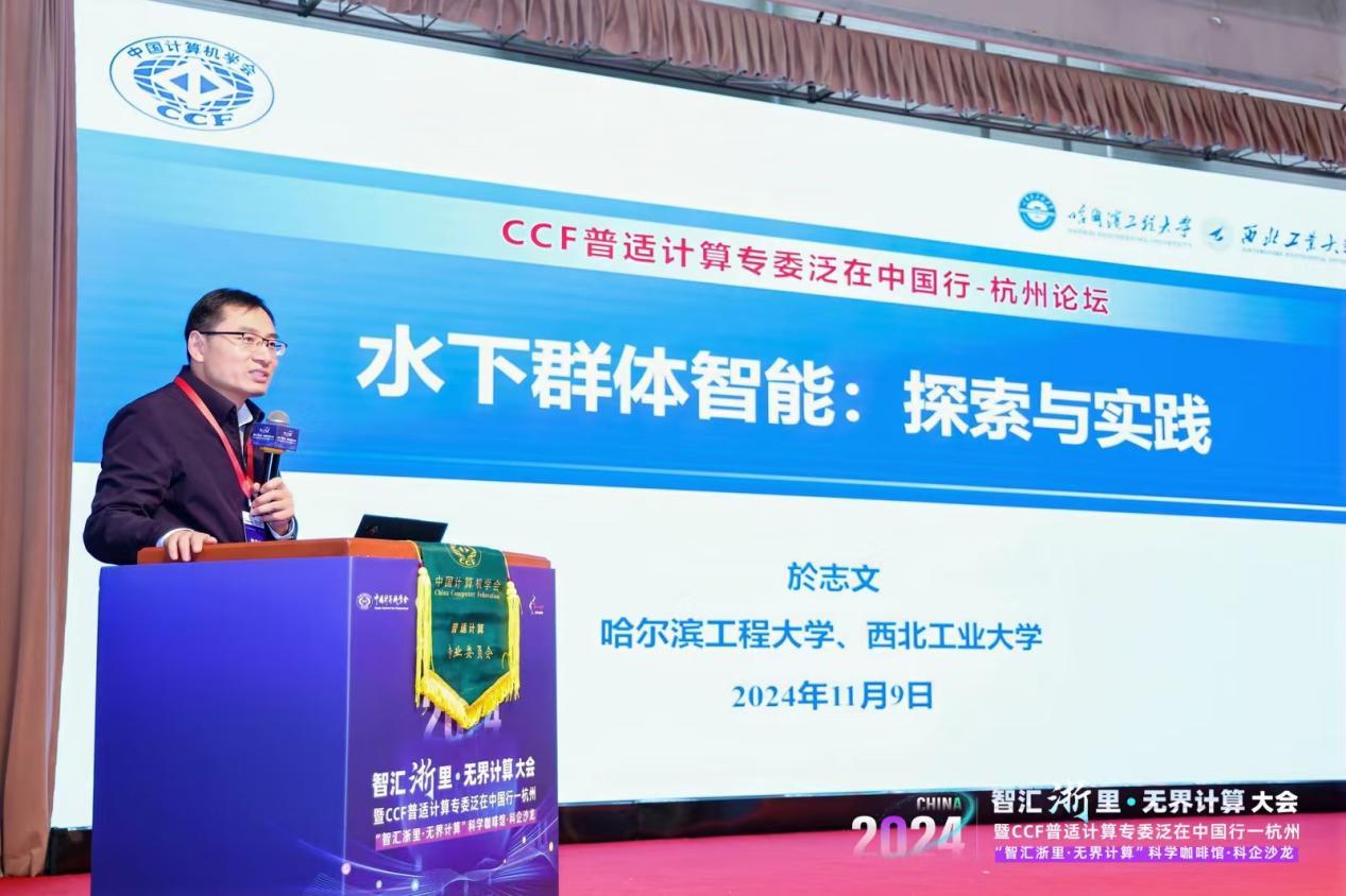 哈尔滨工程大学於志文副校长则分享了“水下群体智能:探索与实践”的研究成果,介绍了水下群体智能的研究背景、关键技术及团队在水下机器人协同作业方面的探索和实践。