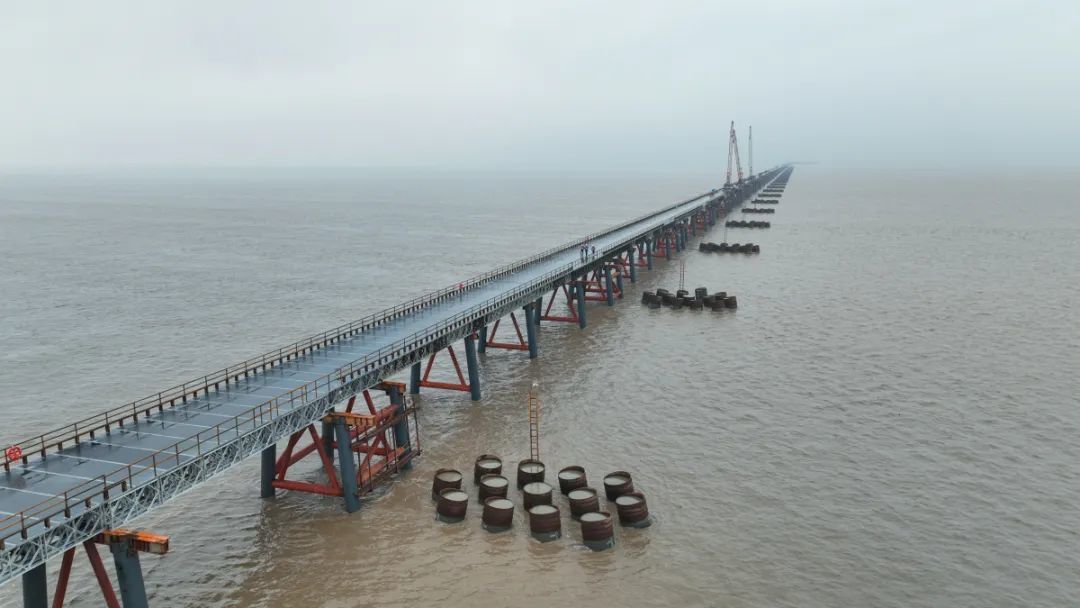 近日,通苏嘉甬高铁杭州湾跨海铁路桥南海中引桥6.96公里栈桥顺利贯通,标志着大桥施工进入新阶段。杭州湾跨海铁路桥是新建通苏嘉甬高铁的控制性工程,全长29.2公里,采用时速350公里的双线无砟轨道设计。