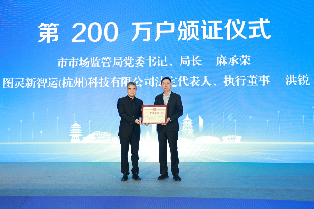 全市第200万户经营主体代表洪锐说,从最初决定要在杭州设立子公司到最终拿到营业执照,耗时不超过两周。“有幸成为杭州第200万户经营主体,我们很高兴。母公司图灵新智算作为一家专注于新型算力服务的高科技企业,之所以选择在杭州临平设立子公司,正是看中了杭州优越的营商环境。临平算力小镇集聚了丰富的算力资源,周边又汇聚了大量的人工智能产业链上下游企业,为企业发展提供了肥沃土壤。此外,杭州市和临平区政府为企业提供了全方位的支持,从协助对接资金和客户资源,到快速办理登记手续,都展现出高效务实的服务态度,对未来发展我们充满信心。”