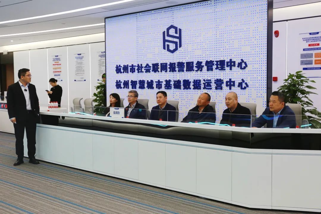 在杭州市安保服务集团,联合会及浙江电视台一行走进杭州市社会联网报警服务管理中心(杭州智慧城市基础数据运营中心),听取杜展明副总对“人防、技防、物防、犬防”四防一体社会化安全服务体系的介绍,了解安保企业在大型活动安保服务中的特色经验做法,并实地观摩安保领域数字化应用场景展示,见证了安全与科技的紧密交织,让人领略到信息技术如何重塑生产与生活环境,激发了对未来智慧城市安全建设的无限遐想。