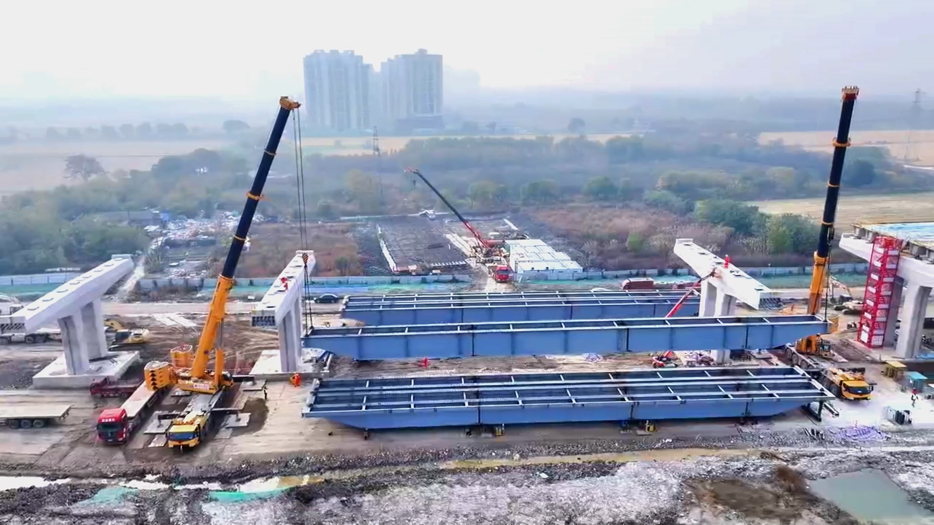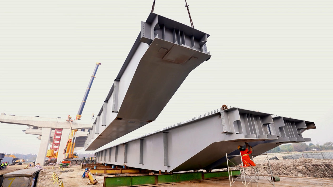 施工现场,力达建设负责人员通过对讲机与起重机操作人员密切对接、默契配合,两台大型起重机伸出长长机械臂,把约60米长的钢箱梁缓缓抬起,精准将其架设到高架桥盖梁指定位置。