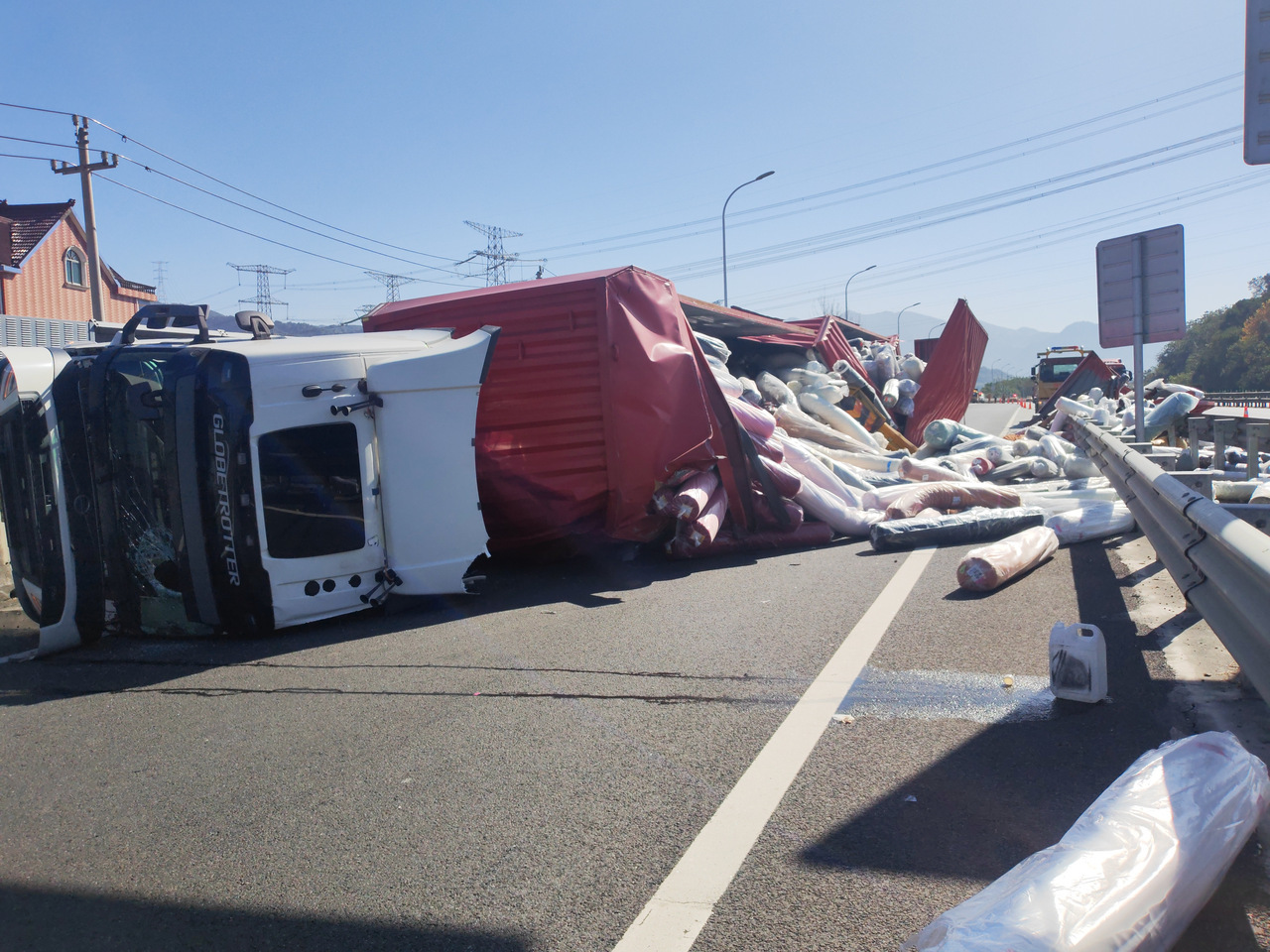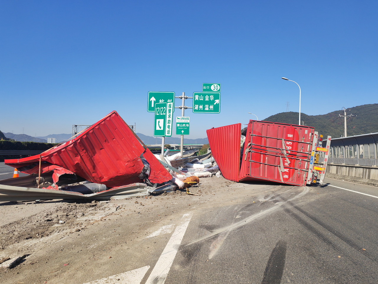 这一幕发生在12月2日。当天11时25分,杭州市公安局高速交警支队五大队综合勤务室的值班巡查员万明杰在进行视频巡查时,发现G25杭新景高速往杭州方向的中埠枢纽路段发生了一起交通事故。一辆红色挂车失控发生侧翻,倒地的瞬间猛烈撞击到分流岛后滑行了十几米,车顶被瞬间“撕裂”,部分顶棚已脱离车身,装载的布匹顿时倾泻一地,散落在主线上,一片狼藉。车身横亘整个互通匝道。紧随其后的车辆被迫连环急刹,其中一辆货车紧急制动时轮胎与地面摩擦,冒出一缕白烟,路面留下两道浓黑的轮胎印迹。