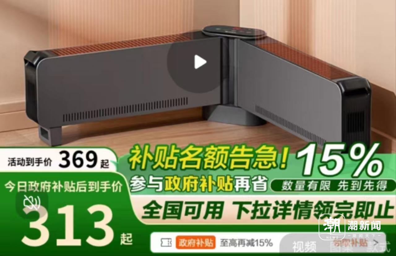 记者在网上搜索发现,这些冬季取暖必备“温暖家电”大都能享受政府补贴。以格力的一款节能遥控踢脚线为例,该产品市场售价369元,参与政府补贴后能的价格为313元,销量同比增长明显。另一款美的品牌新款烤火炉,享受立减15%的补贴,刚推出不久已经热销超1000台。