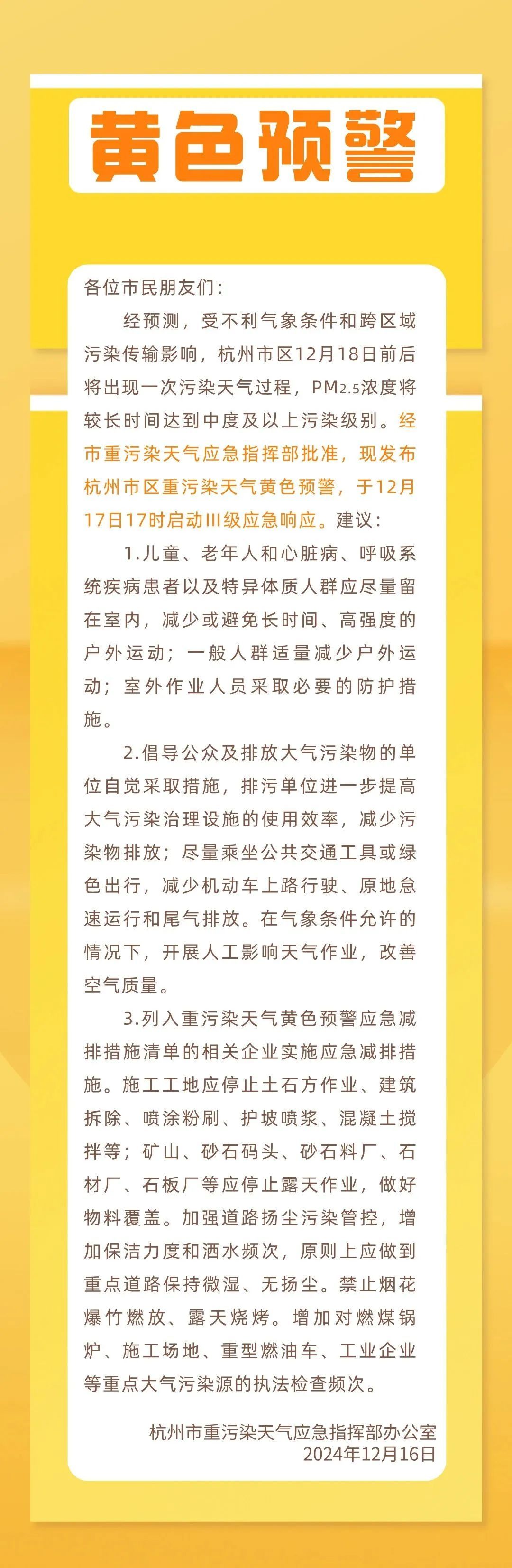 因受不利气象条件和跨区域污染传输影响,杭州市区12月18日前后将出现一次污染天气过程,PM2.5浓度将较长时间达到中度及以上污染级别。经市重污染天气应急指挥部批准,现发布杭州市区重污染天气黄色预警,于12月17日17时启动Ⅲ级应急响应。